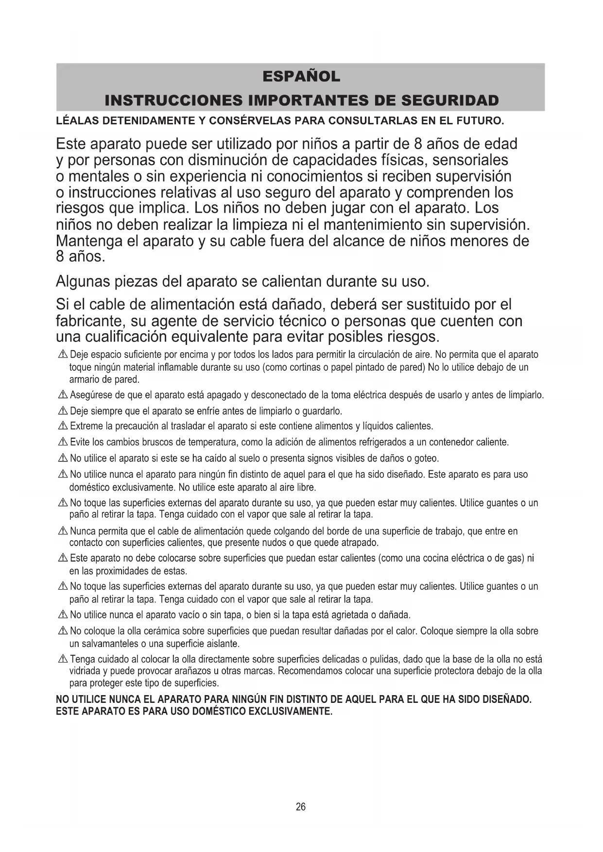 LÉALAS DETENIDAMENTE Y CONSÉRVELAS PARA CONSULTARLAS EN EL FUTURO. Esteaparatopuedeserutilizadoporniñosapartirde8añosdeedad yporpersonascondisminucióndecapacidadesfísicas,sensoriales omentalesosinexperiencianiconocimientossirecibensupervisión oinstruccionesrelativasalusosegurodelaparatoycomprendenlos riesgos que implica. Los niños no deben jugar con el aparato. Los niñosnodebenrealizarlalimpiezanielmantenimientosinsupervisión. Mantengaelaparatoysucablefueradelalcancedeniñosmenoresde 8 años. Algunaspiezasdelaparatosecalientandurantesuuso. Sielcabledealimentaciónestádañado,deberásersustituidoporel fabricante, su agente de servicio técnico o personas que cuenten con unacualificaciónequivalenteparaevitarposiblesriesgos. ! Deje espacio suficiente por encima y por todos los lados para permitir la circulación de aire. No permita que el aparato toque ningún material inflamable durante su uso (como cortinas o papel pintado de pared) No lo utilice debajo de un armario de pared. ! Asegúrese de que el aparato está apagado y desconectado de la toma eléctrica después de usarlo y antes de limpiarlo. ! Deje siempre que el aparato se enfríe antes de limpiarlo o guardarlo. ! Extreme la precaución al trasladar el aparato si este contiene alimentos y líquidos calientes. ! Evite los cambios bruscos de temperatura, como la adición de alimentos refrigerados a un contenedor caliente. ! No utilice el aparato si este se ha caído al suelo o presenta signos visibles de daños o goteo. ! No utilice nunca el aparato para ningún fin distinto de aquel para el que ha sido diseñado. Este aparato es para uso doméstico exclusivamente. No utilice este aparato al aire libre. ! No toque las superficies externas del aparato durante su uso, ya que pueden estar muy calientes. Utilice guantes o un paño al retirar la tapa. Tenga cuidado con el vapor que sale al retirar la tapa. ! Nunca permita que el cable de alimentación quede colgando del borde de una superficie de trabajo, que entre en contacto con superficies calientes, que presente nudos o que quede atrapado. ! Este aparato no debe colocarse sobre superficies que puedan estar calientes (como una cocina eléctrica o de gas) ni en las proximidades de estas. ! No toque las superficies externas del aparato durante su uso, ya que pueden estar muy calientes. Utilice guantes o un paño al retirar la tapa. Tenga cuidado con el vapor que sale al retirar la tapa. ! No utilice nunca el aparato vacío o sin tapa, o bien si la tapa está agrietada o dañada. ! No coloque la olla cerámica sobre superficies que puedan resultar dañadas por el calor. Coloque siempre la olla sobre un salvamanteles o una superficie aislante. ! Tenga cuidado al colocar la olla directamente sobre superficies delicadas o pulidas, dado que la base de la olla no está vidriada y puede provocar arañazos u otras marcas. Recomendamos colocar una superficie protectora debajo de la olla para proteger este tipo de superficies. NO UTILICE NUNCA EL APARATO PARA NINGÚN FIN DISTINTO DE AQUEL PARA EL QUE HA SIDO DISEÑADO. ESTE APARATO ES PARA USO DOMÉSTICO EXCLUSIVAMENTE.27