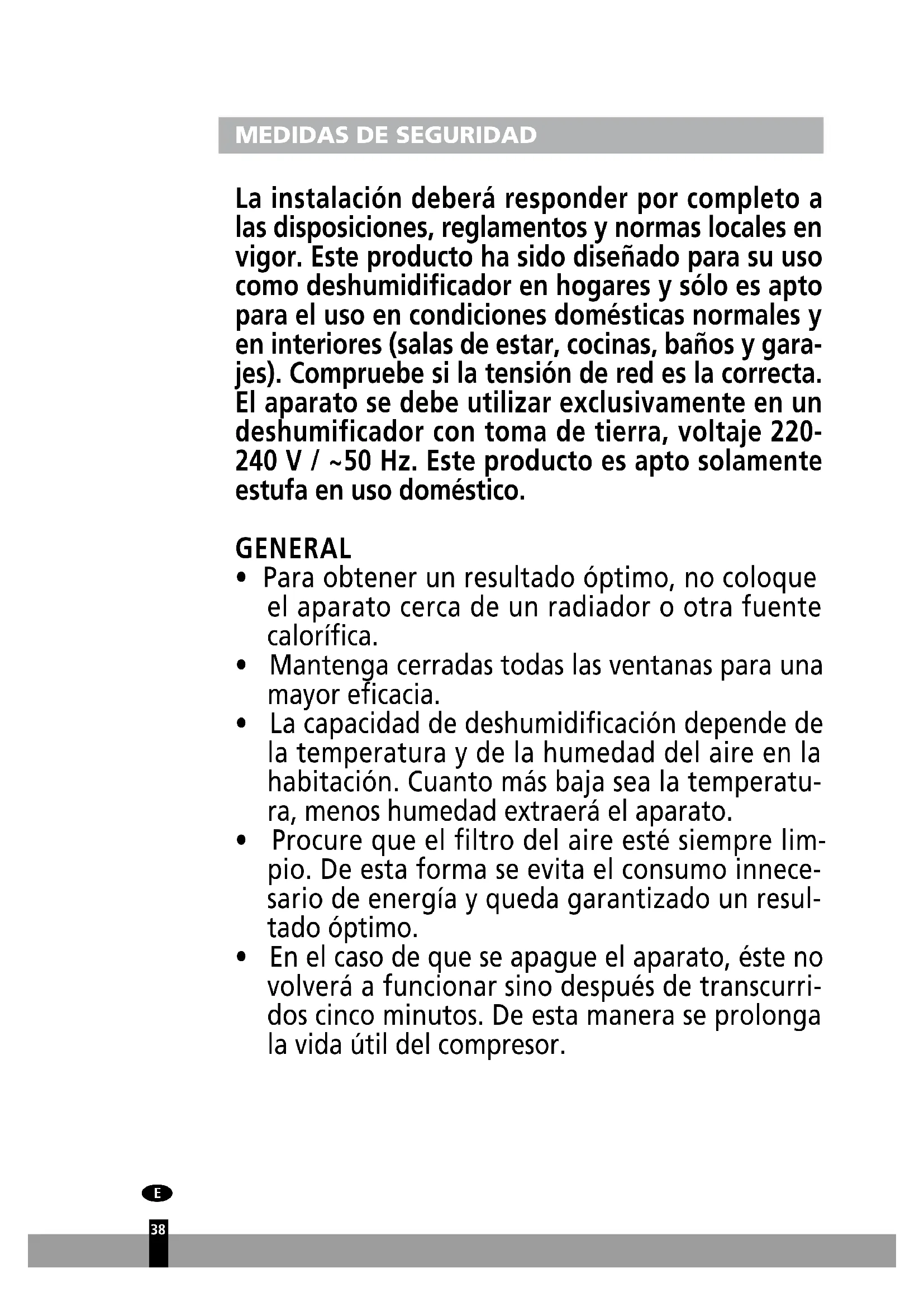 La instalación deberá responder por completo a las disposiciones, reglamentos y normas locales en vigor. Este producto ha sido diseñado para su uso como deshumidificador en hogares y sólo es apto para el uso en condiciones domésticas normales y en interiores (salas de estar, cocinas, baños y gara- jes). Compruebe si la tensión de red es la correcta. El aparato se debe utilizar exclusivamente en un deshumificador con toma de tierra, voltaje 220- 240 V / ~50 Hz. Este producto es apto solamente estufa en uso doméstico. GENERAL