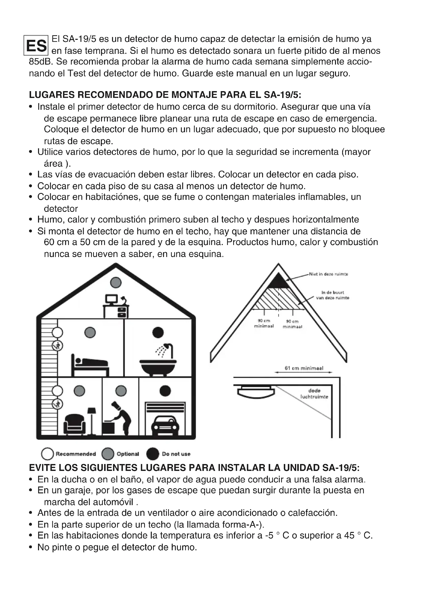 - Si monta el detector de humo en el techo, hay que mantener una distancia de 60 cm a 50 cm de la pared y de la esquina. Productos humo, calor y combustión nunca se mueven a saber, en una esquina. EVITE LOS SIGUIENTES LUGARES PARA INSTALAR LA UNIDAD SA-19/5: