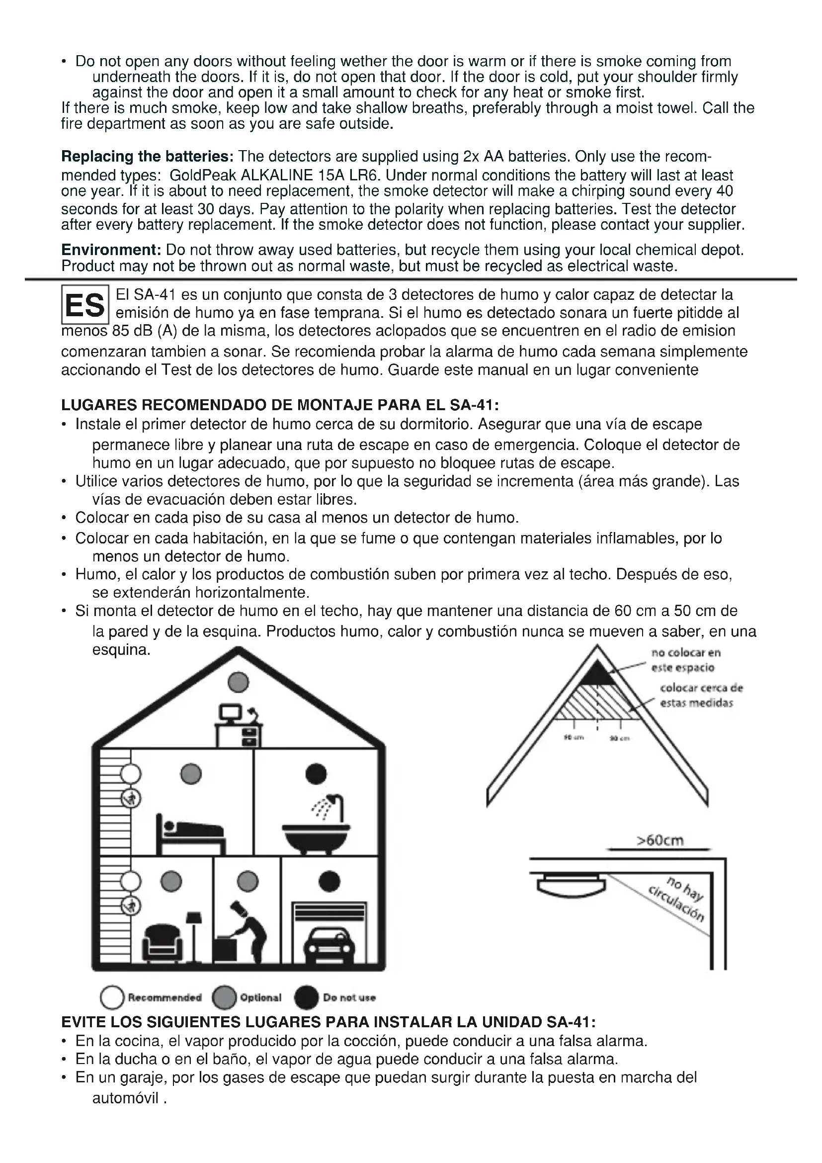 - Do not open any doors without feeling wether the door is warm or if there is smoke coming from underneath the doors. If it is, do not open that door. If the door is cold, put your shoulder firmly against the door and open it a small amount to check for any heat or smoke first. If there is much smoke, keep low and take shallow breaths, preferably through a moist towel. Call the fire department as soon as you are safe outside. Replacing the batteries: The detectors are supplied using 2x AA batteries. Only use the recom- mended types: GoldPeak ALKALINE 15A LR6. Under normal conditions the battery will last at least one year. If it is about to need replacement, the smoke detector will make a chirping sound every 40 seconds for at least 30 days. Pay attention to the polarity when replacing batteries. Test the detector after every battery replacement. If the smoke detector does not function, please contact your supplier. Environment: Do not throw away used batteries, but recycle them using your local chemical depot. Product may not be thrown out as normal waste, but must be recycled as electrical waste.USO DE APLICACIONES, PRUEBAS Y MANTENIMIENTO: Uso: El detector de humo entra en funcionamiento tan pronto como tengamos colocada 2x pilas AA (LR06) . Asegurese que el pequeño borde de seguridad color rojo se volvió hacia adentro. La unidad de SA-41 ahora se puede montar en el techo. Sólo cuando los dos diferentes tipos de baterías fue- ron colocados en la posición correcta, la unidad de SA-41 se puede montar en la placa de cubierta. Una vez que el humo entre en contacto con el detector de humo la alarma se activa inmediatamente. Una vez que el humo o los gases desaparecen, la alarma se apagará automáticamente por sí misma. Antes de vincular los detectores de humo en conjunto, el primer detector de humo debe registrarse. El número de entradas no está limitado. Registrar: Tome una alarma SA-41. Mantenga presionado el botón durante 12 segundos hasta que la luz deje de parpadear y permane- zca. Inmediatamente suelte ahora. (Repita este paso si la lámpara comienza a parpadear pronto). La luz durará 30 segundos. En este período, pulse el botón de cualquier otra alarma de humo y suelte tan pronto como se encienda la lámpara. Si el inicio de sesión va bien, las luces de ambos detectores parpadearán. Pulse la primera tecla de alarma brevemente para detener el procedimiento de registro. La distancia entre el dispositivo configurado en el modo de registro y el dispositivo que se está registrando es de hasta 20 metros. Ejemplo: Si el dispositivo (A) está registrado en el dispositivo (B) y el dispositivo (C), la distancia entre el dispositivo (B) y (C) puede ser de hasta 40 metros, siempre que el dispositivo (A) esté
