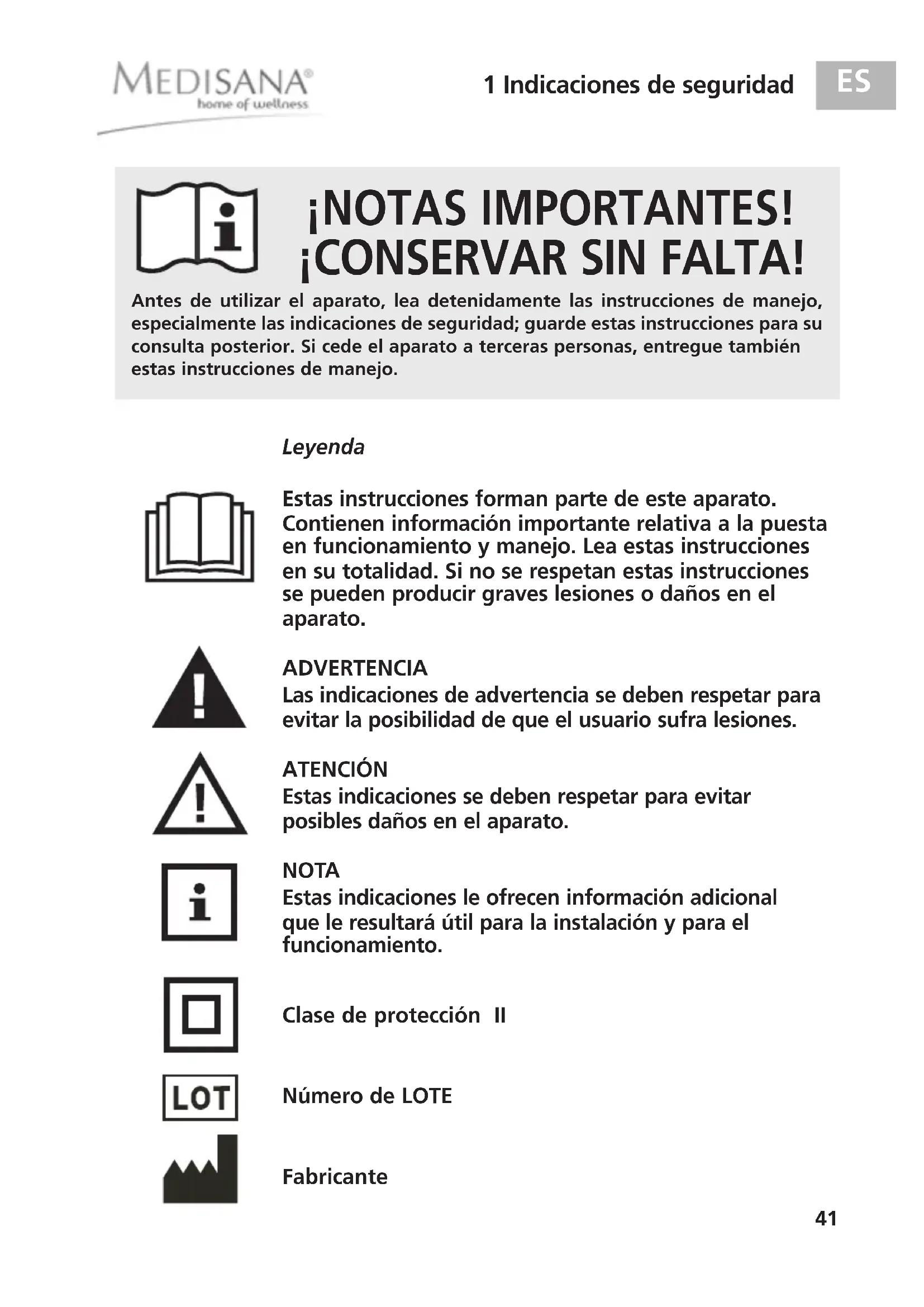 ¡NOTAS IMPORTANTES! ¡CONSERVAR SIN FALTA! Estas instrucciones forman parte de este aparato. Contienen información importante relativa a la puesta en funcionamiento y manejo. Lea estas instrucciones en su totalidad. Si no se respetan estas instrucciones se pueden producir graves lesiones o daños en el aparato. ADVERTENCIA Las indicaciones de advertencia se deben respetar para evitar la posibilidad de que el usuario sufra lesiones. ATENCIÓN Estas indicaciones se deben respetar para evitar posibles daños en el aparato. NOTA Estas indicaciones le ofrecen información adicional que le resultará útil para la instalación y para el funcionamiento. Clase de protección II Número de LOTE Fabricante Antes de utilizar el aparato, lea detenidamente las instrucciones de manejo,especialmente las indicaciones de seguridad; guarde estas instrucciones para suconsulta posterior. Si cede el aparato a terceras personas, entregue tambiénestas instrucciones de manejo. Leyenda 88930_MCN_WEST_Final_aktual.qxd:Massagesitz 31.03.2011 10:43 Uhr Seite 4142 1 Indicaciones de seguridad