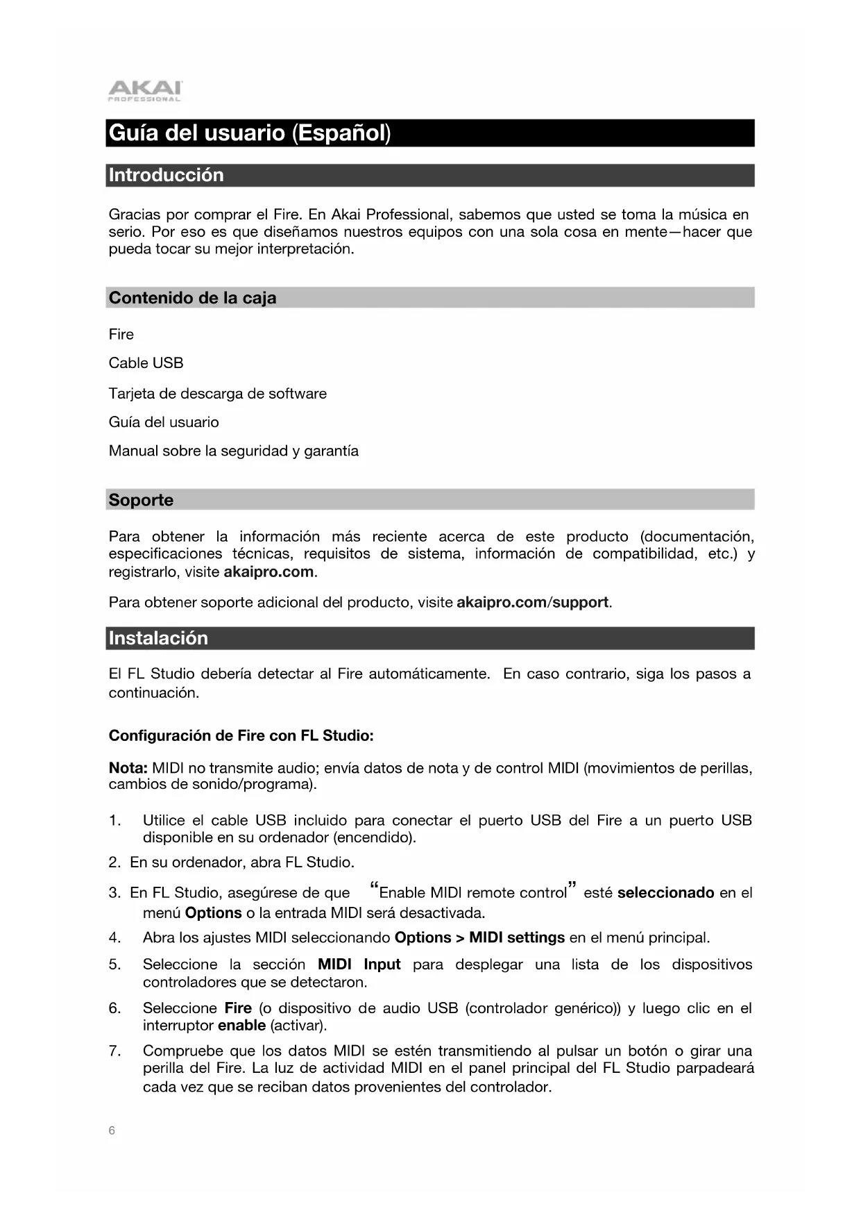 Guía del usuario (Español) Introducción Gracias por comprar el Fire. En Akai Professional, sabemos que usted se toma la música en serio. Por eso es que diseñamos nuestros equipos con una sola cosa en mente—hacer que pueda tocar su mejor interpretación. Contenido de la caja Fire Cable USB Tarjeta de descarga de software Guía del usuario Manual sobre la seguridad y garantía Soporte Para obtener la información más reciente acerca de este producto (documentación, especificaciones técnicas, requisitos de sistema, información de compatibilidad, etc.) y registrarlo, visite akaipro.com. Para obtener soporte adicional del producto, visite akaipro.com/support. Instalación