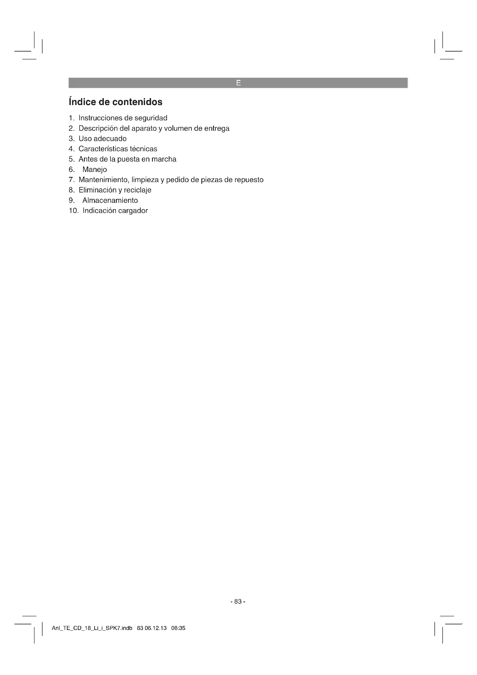 Sólo para países miembros de la UE No tirar herramientas eléctricas en la basura casera. Según la directiva europea 2002/96/CE sobre aparatos usados electrónicos y eléctricos y su aplicación en el derecho nacional, dichos aparatos deberán recojerse por separado y eliminarse de modo ecológi- co para facilitar su posterior reciclaje. Alternativa de reciclaje en caso de devolución: El propietario del aparato eléctrico, en caso de no optar por su devolución, está obligado a reciclar ade- cuadamente dicho aparato eléctrico. Para ello, también se puede entregar el aparato usado a un centro de reciclaje que trate la eliminación de residuos respetando la legislación nacional sobre residuos y su reciclaje. Esto no afecta a los medios auxiliares ni a los accesorios sin componentes eléctricos que acompañan a los aparatos usados. Sólo está permitido copiar la documentación y documentos anexos del producto, o extractos de los mismos, con autorización expresa de iSC GmbH. Nos reservamos el derecho a realizar modicaciones técnicas Anl_TE_CD_18_Li_i_SPK7.indb 91 06.12.13 08:35E