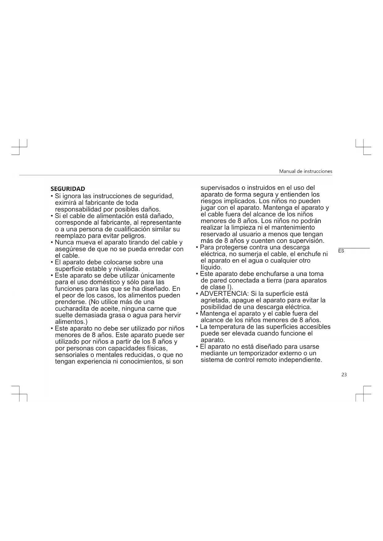 - Este aparato no debe ser utilizado por niños menores de 8 años. Este aparato puede ser utilizado por niños a partir de los 8 años y por personas con capacidades físicas, sensoriales o mentales reducidas, o que no tengan experiencia ni conocimientos, si son supervisados o instruidos en el uso del aparato de forma segura y entienden los riesgos implicados. Los niños no pueden jugar con el aparato. Mantenga el aparato y el cable fuera del alcance de los niños menores de 8 años. Los niños no podrán realizar la limpieza ni el mantenimiento reservado al usuario a menos que tengan más de 8 años y cuenten con supervisión.