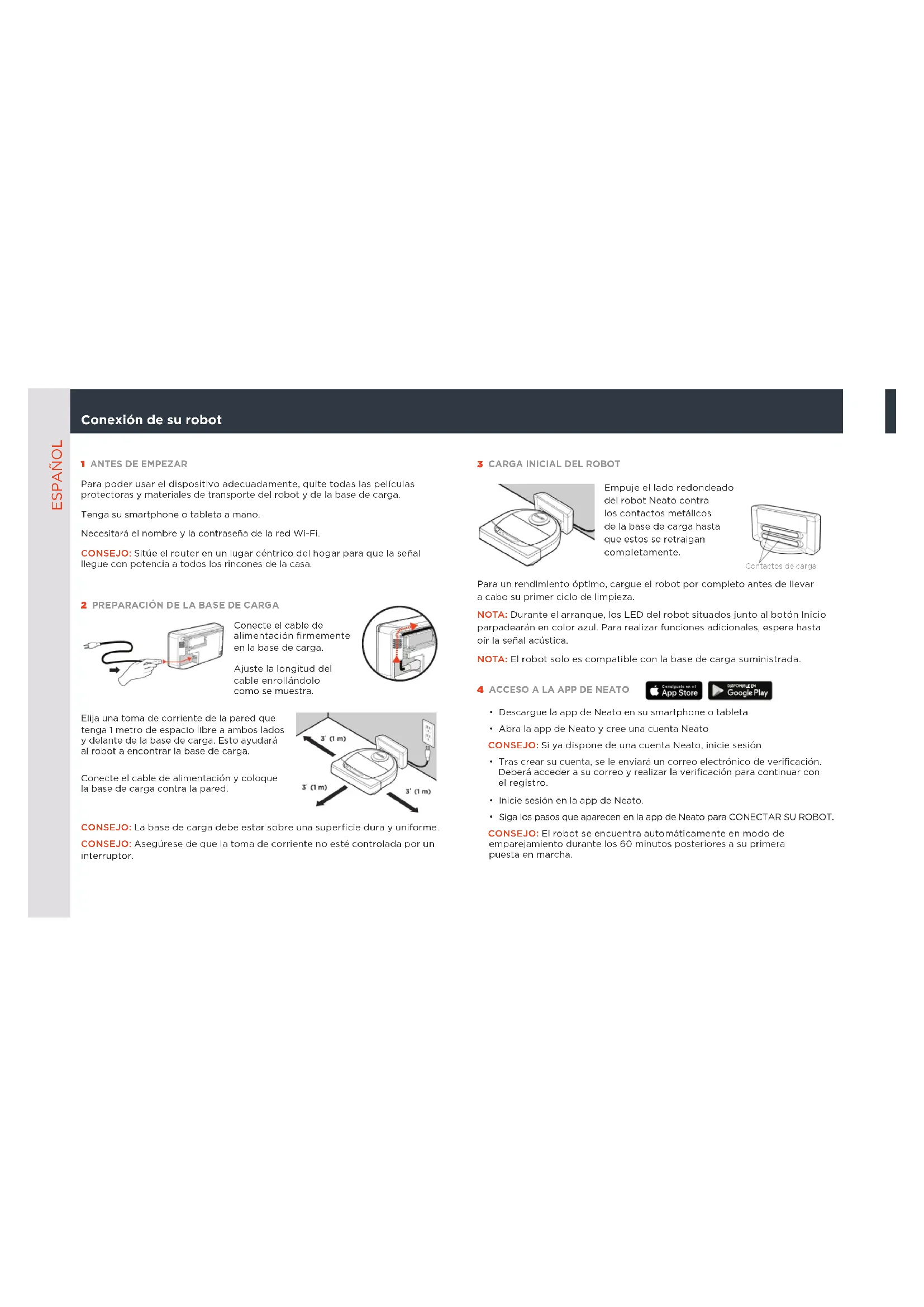 - Batterie: ogni 12 o 18 mesi La Guida per l’utente è disponibile su www.NeatoRobotics.com/UG Un video di istruzioni è disponibile su www.NeatoRobotics.com/support1 ANTES DE EMPEZAR Para poder usar el dispositivo adecuadamente, quite todas las películas protectoras y materiales de transporte del robot y de la base de carga. Tenga su smartphone o tableta a mano. Necesitará el nombre y la contraseña de la red Wi-Fi. CONSEJO: Sitúe el router en un lugar céntrico del hogar para que la señal llegue con potencia a todos los rincones de la casa.