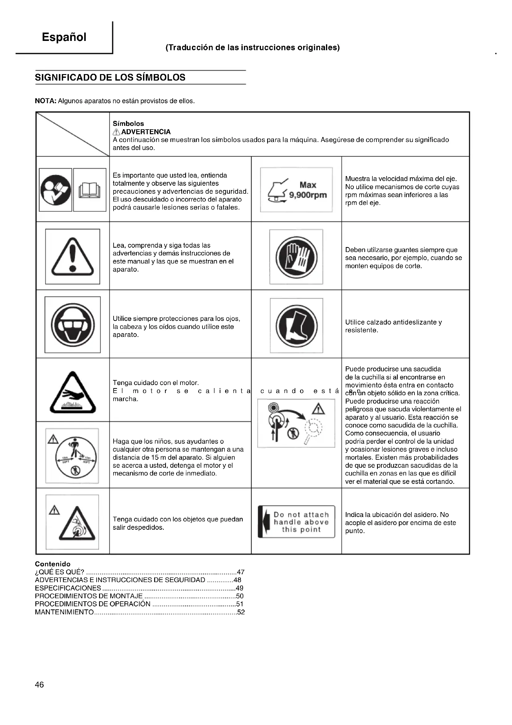 NOTA: Algunos aparatos no están provistos de ellos. Símbolos ADVERTENCIA A continuación se muestran los símbolos usados para la máquina. Asegúrese de comprender su signifi cado antes del uso. Es importante que usted lea, entienda totalmente y observe las siguientes precauciones y advertencias de seguridad. El uso descuidado o incorrecto del aparato podrá causarle lesiones serias o fatales. Muestra la velocidad máxima del eje. No utilice mecanismos de corte cuyas rpm máximas sean inferiores a las rpm del eje. Lea, comprenda y siga todas las advertencias y demás instrucciones de este manual y las que se muestran en el aparato. Deben utilzarse guantes siempre que sea necesario, por ejemplo, cuando se monten equipos de corte. Utilice siempre protecciones para los ojos, la cabeza y los oídos cuando utilice este aparato. Utilice calzado antideslizante y resistente. Tenga cuidado con el motor. El motor se calienta cuando está en marcha. Puede producirse una sacudida de la cuchilla si al encontrarse en movimiento ésta entra en contacto con un objeto sólido en la zona crítica. Puede producirse una reacción peligrosa que sacuda violentamente el aparato y al usuario. Esta reacción se conoce como sacudida de la cuchilla. Como consecuencia, el usuario podría perder el control de la unidad y ocasionar lesiones graves e incluso mortales. Existen más probabilidades de que se produzcan sacudidas de la cuchilla en zonas en las que es difícil ver el material que se está cortando. Haga que los niños, sus ayudantes o cualquier otra persona se mantengan a una distancia de 15 m del aparato. Si alguien se acerca a usted, detenga el motor y el mecanismo de corte de inmediato. Tenga cuidado con los objetos que puedan salir despedidos. Indica la ubicación del asidero. No acople el asidero por encima de este punto. Contenido