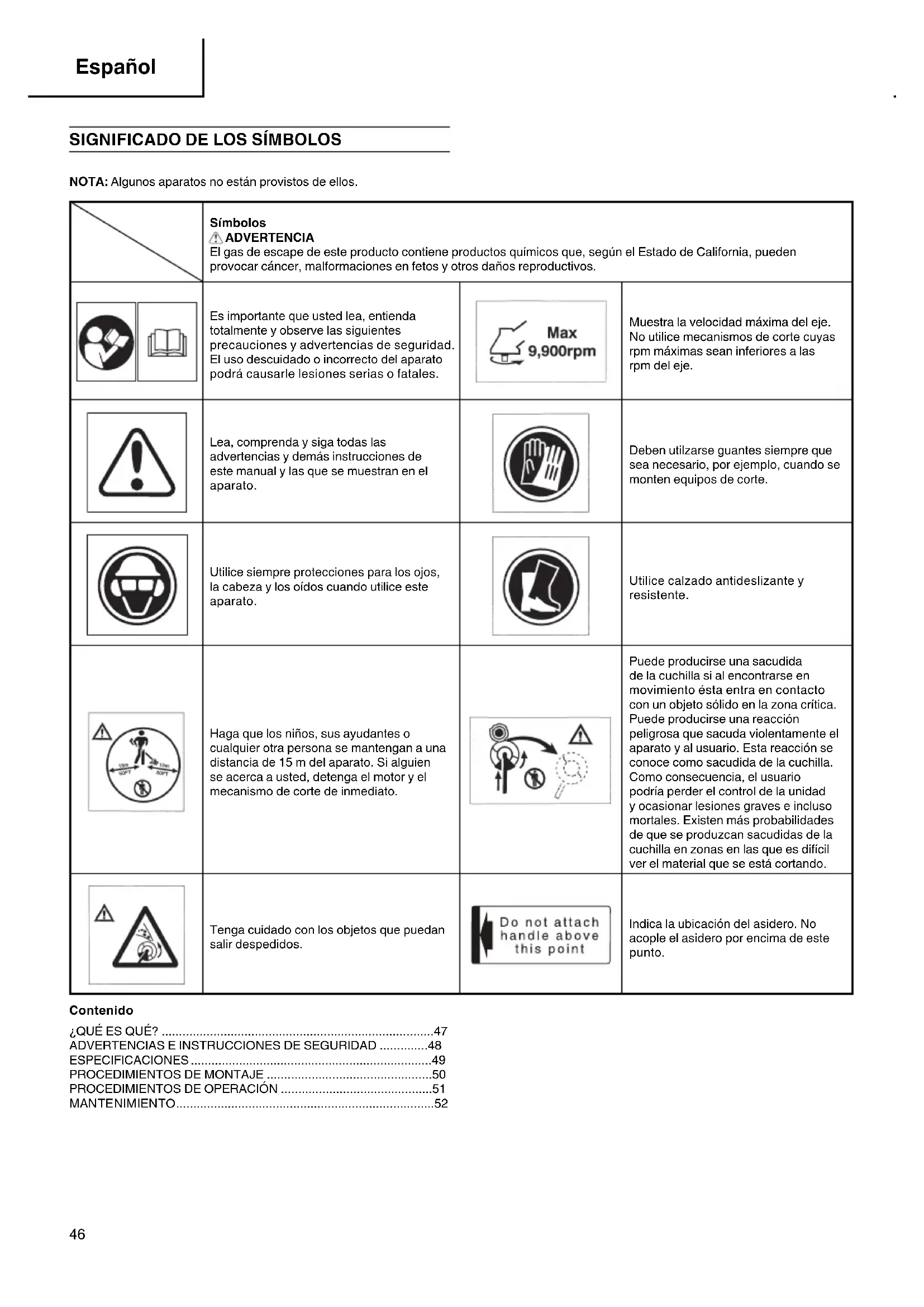 NOTA: Algunos aparatos no están provistos de ellos. Símbolos ADVERTENCIA El gas de escape de este producto contiene productos químicos que, según el Estado de California, pueden provocar cáncer, malformaciones en fetos y otros daños reproductivos. Es importante que usted lea, entienda totalmente y observe las siguientes precauciones y advertencias de seguridad. El uso descuidado o incorrecto del aparato podrá causarle lesiones serias o fatales. Muestra la velocidad máxima del eje. No utilice mecanismos de corte cuyas rpm máximas sean inferiores a las rpm del eje. Lea, comprenda y siga todas las advertencias y demás instrucciones de este manual y las que se muestran en el aparato. Deben utilzarse guantes siempre que sea necesario, por ejemplo, cuando se monten equipos de corte. Utilice siempre protecciones para los ojos, la cabeza y los oídos cuando utilice este aparato. Utilice calzado antideslizante y resistente. Haga que los niños, sus ayudantes o cualquier otra persona se mantengan a una distancia de 15 m del aparato. Si alguien se acerca a usted, detenga el motor y el mecanismo de corte de inmediato. Puede producirse una sacudida de la cuchilla si al encontrarse en movimiento ésta entra en contacto con un objeto sólido en la zona crítica. Puede producirse una reacción peligrosa que sacuda violentamente el aparato y al usuario. Esta reacción se conoce como sacudida de la cuchilla. Como consecuencia, el usuario podría perder el control de la unidad y ocasionar lesiones graves e incluso mortales. Existen más probabilidades de que se produzcan sacudidas de la cuchilla en zonas en las que es difícil ver el material que se está cortando. Tenga cuidado con los objetos que puedan salir despedidos. Indica la ubicación del asidero. No acople el asidero por encima de este punto. Contenido