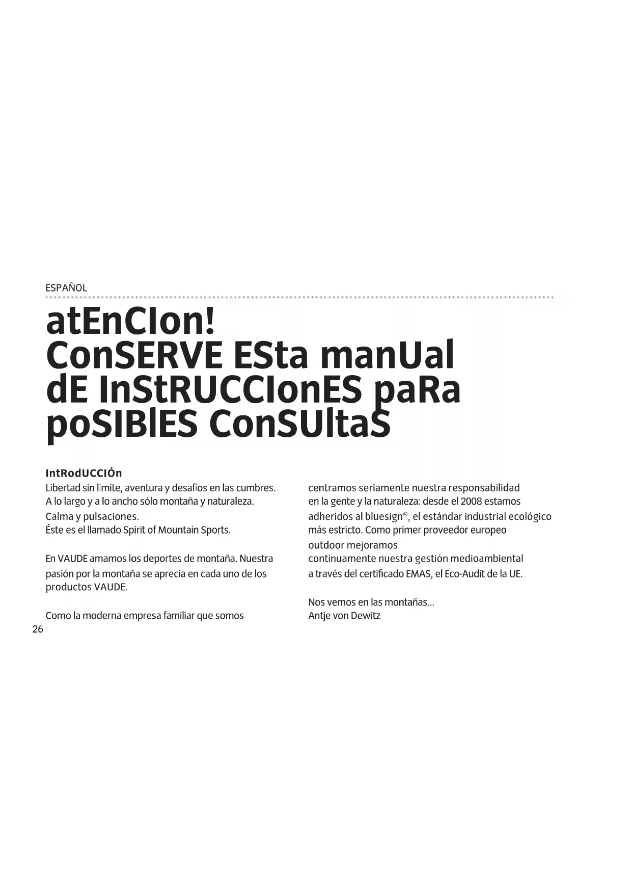 - Non tendere i tiranti nelle zone di passaggio perché al buio vi si potrebbe inciampare.26 ESPAÑOL atEnCIon! ConSERVE ESta manUal dE InStRUCCIonES paRa poSIBlES ConSUltaS IntRodUCCIón Libertad sin límite, aventura y desafíos en las cumbres. A lo largo y a lo ancho sólo montaña y naturaleza. Calma y pulsaciones. Éste es el llamado Spirit of Mountain Sports. En VAUDE amamos los deportes de montaña. Nuestra pasión por la montaña se aprecia en cada uno de los productos VAUDE. Como la moderna empresa familiar que somos centramos seriamente nuestra responsabilidad en la gente y la naturaleza: desde el 2008 estamos adheridos al bluesign®, el estándar industrial ecológico más estricto. Como primer proveedor europeo outdoor mejoramos continuamente nuestra gestión medioambiental a través del certificado EMAS, el Eco-Audit de la UE. Nos vemos en las montañas... Antje von Dewitz27 ESPAÑOL ElECCIón dEl tERREno: