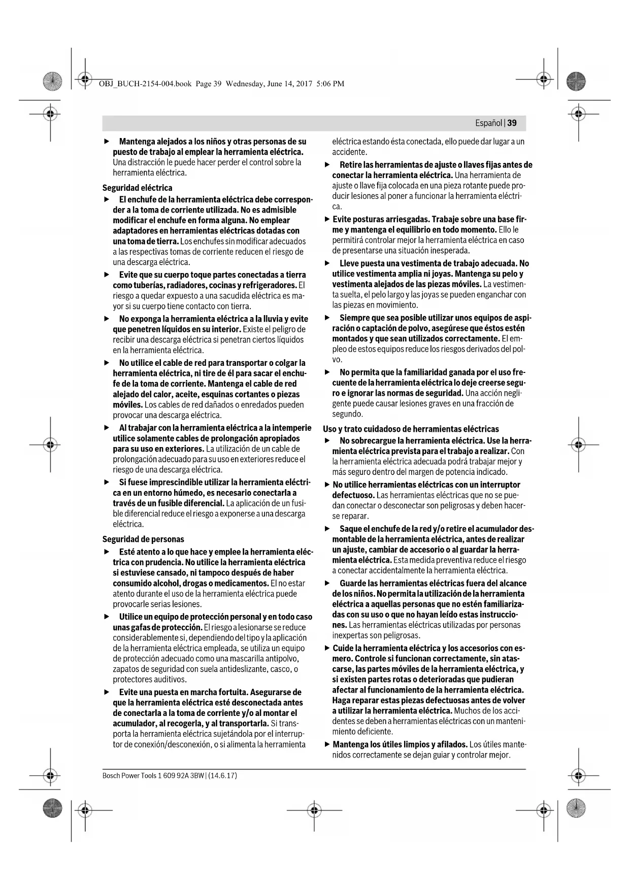 amienta eléctrica adecuada podrá trabajar mejor y más seguro dentro del margen de potencia indicado. No utilice herramientas eléctricas con un interruptor defectuoso. Las herramientas eléctricas que no se pue- dan conectar o desconectar son peligrosas y deben hacer- se reparar. Saque el enchufe de la red y/o retire el acumulador des- montable de la herramienta eléctrica, antes de realizar un ajuste, cambiar de accesorio o al guardar la herra- mienta eléctrica. Esta medida preventiva reduce el riesgo a conectar accidentalmente la herramienta eléctrica. Guarde las herramientas eléctricas fuera del alcance de los niños. No permita la utilización de la herramienta eléctrica a aquellas personas que no estén familiariza- das con su uso o que no hayan leído estas instruccio- nes. Las herramientas eléctricas utilizadas por personas inexpertas son peligrosas. Cuide la herramienta eléctrica y los accesorios con es- mero. Controle si funcionan correctamente, sin atas- carse, las partes móviles de la herramienta eléctrica, y si existen partes rotas o deterioradas que pudieran afectar al funcionamiento de la herramienta eléctrica. Haga reparar estas piezas defectuosas antes de volver a utilizar la herramienta eléctrica. Muchos de los acci- dentes se deben a herramientas eléctricas con un manteni- miento deficiente. Mantenga los útiles limpios y afilados. Los útiles mante- nidos correctamente se dejan guiar y controlar mejor. OBJ_BUCH-2154-004.book Page 39 Wednesday, June 14, 2017 5:06 PM40 | Español 1 609 92A 3BW | (14.6.17) Bosch Power Tools Utilice la herramienta eléctrica, accesorios, útiles, etc. de acuerdo a estas instrucciones, considerando en ello las condiciones de trabajo y la tarea a realizar. El uso de herramientas eléctricas para trabajos diferentes de aque- llos para los que han sido concebidas puede resultar peli- groso. Mantenga las empuñaduras y las superficies de las em- puñaduras secas, limpias y libres de aceite y grasa. Las empuñaduras y las superficies de las empuñaduras resba- ladizas no permiten un manejo y control seguro de la herra- mienta eléctrica en situaciones imprevistas. Servicio Únicamente haga reparar su herramienta eléctrica por un profesional, empleando exclusivamente piezas de repuesto originales. Solamente así se mantiene la seguri- dad de la herramienta eléctrica. Instrucciones de seguridad para ingletadoras Las sierras oscilantes para cortar ingletes se han pre- visto para cortar madera o productos semejantes y no se pueden utilizar para el corte abrasivo de materiales metálicos tales como barras, varillas, tornillos, etc. El polvo abrasivo conduce al bloqueo de las piezas móviles como las de la caperuza protectora inferior. Las chispas del corte abrasivo queman la caperuza protectora inferior, la placa y otras piezas de plástico. En lo posible, fije la pieza de trabajo con abrazaderas. En caso de sujetar la pieza de trabajo con la mano, man- tenga siempre alejada su mano como mínimo 100 mm de cada lado de la hoja de sierra. No utilice esta sierra para cortar piezas, que son muy pequeñas para fijarlas en forma segura o sujetarlas con la mano. Si coloca su mano demasiado cerca de la hoja de sierra, existe un ele- vado riesgo de lesión por el contacto con la misma. La pieza de trabajo debe quedar inmovilizada ya sea con abrazaderas o por el apriete contra el tope y la me- sa. No desplace la pieza de trabajo hacia la hoja de sie- rra y no corte nunca “a manos libres”. Las piezas de tra- bajo sueltas o móviles pueden salir disparadas a gran velocidad y causar lesiones. Desplace la sierra a través de la pieza de trabajo. Evite tirar la sierra a través de la pieza de trabajo. Para hacer un corte, eleve el cabezal de la sierra y tírelo por sobre la pieza de trabajo sin cortar, arranque el motor, pre- sione hacia abajo el cabezal de la sierra y desplace la sierra a través de la pieza de trabajo. Al cortar tirando existe el peligro, que la hoja de sierra se suba a la pieza de trabajo y la unidad de la hoja de sierra se lance violenta- mente hacia el operador. Nunca cruce su mano a través de la línea de corte pre- vista, ni delante ni detrás de la hoja de sierra. El apoyo de la pieza de trabajo “a manos cruzadas”, es decir, soste- ner la pieza de trabajo a la derecha de la hoja de sierra con la mano izquierda o viceversa, es muy peligroso. Mientras la hoja de sierra esté girando, no acerque nin- guna de las manos detrás del tope a menos de 100 mm de cualquier lado de la hoja de sierra, para remover re- tazos de madera o por cualquier otra razón. Posible- mente la proximidad de la hoja de sierra giratoria a su ma- no no es evidente y, por ello, puede lastimarse seriamente. Examine la pieza de trabajo antes de realizar el corte. Si la pieza de trabajo está doblada o deformada, fíjela con el lado curvado exterior hacia el tope. Asegúrese siem- pre, que a lo largo de la línea de corte no exista un in- tersticio entre la pieza de trabajo, el tope y la mesa. Las piezas de trabajo dobladas o deformadas se pueden retor- cer o dislocar y causar un atascamiento de la hoja de sierra giratoria durante el corte. No deben haber clavos u otros objetos extraños en la pieza de trabajo. No use la sierra antes que la mesa esté libre de herra- mientas, desperdicios de madera, etc., con excepción de la pieza de trabajo. Los desperdicios pequeños, las piezas de madera sueltas u otros objetos que entren en contacto con la hoja giratoria pueden salir lanzados con una alta velocidad. Corte solamente una pieza de trabajo al mismo tiempo. Las múltiples piezas de trabajo apiladas no se dejan fijar o sujetar adecuadamente y pueden atascar la hoja de sierra o dislocarse durante el corte. Asegúrese que la sierra oscilante para cortar ingletes esté montada o emplazada sobre una superficie de tra- bajo plana y firme antes de su uso. Una superficie de tra- bajo plana y firme reduce el peligro de la inestabilidad la- tente de la sierra