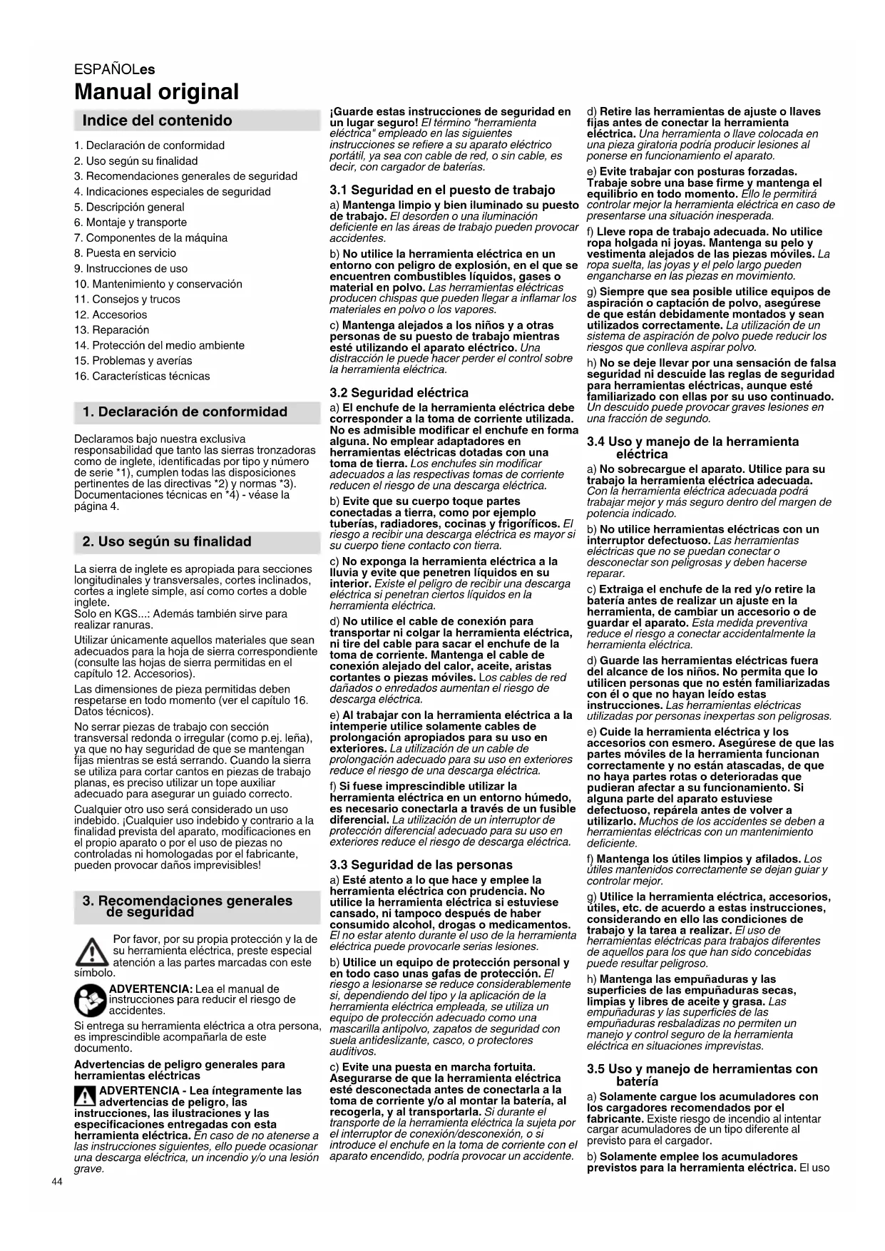 Declaramos bajo nuestra exclusiva responsabilidad que tanto las sierras tronzadoras como de inglete, identificadas por tipo y número de serie *1), cumplen todas las disposiciones pertinentes de las directivas *2) y normas *3). Documentaciones técnicas en *4) - véase la página 4. La sierra de inglete es apropiada para secciones longitudinales y transversales, cortes inclinados, cortes a inglete simple, así como cortes a doble inglete. Solo en KGS...: Además también sirve para realizar ranuras. Utilizar únicamente aquellos materiales que sean adecuados para la hoja de sierra correspondiente (consulte las hojas de sierra permitidas en el capítulo 12. Accesorios). Las dimensiones de pieza permitidas deben respetarse en todo momento (ver el capítulo 16. Datos técnicos). No serrar piezas de trabajo con sección transversal redonda o irregular (como p.ej. leña), ya que no hay seguridad de que se mantengan fijas mientras se está serrando. Cuando la sierra se utiliza para cortar cantos en piezas de trabajo planas, es preciso utilizar un tope auxiliar adecuado para asegurar un guiado correcto. Cualquier otro uso será considerado un uso indebido. ¡Cualquier uso indebido y contrario a la finalidad prevista del aparato, modificaciones en el propio aparato o por el uso de piezas no controladas ni homologadas por el fabricante, pueden provocar daños imprevisibles! Por favor, por su propia protección y la de su herramienta eléctrica, preste especial atención a las partes marcadas con este símbolo. ADVERTENCIA: Lea el manual de instrucciones para reducir el riesgo de accidentes. Si entrega su herramienta eléctrica a otra persona, es imprescindible acompañarla de este documento. Advertencias de peligro generales para herramientas eléctricas ADVERTENCIA - Lea íntegramente las advertencias de peligro, las instrucciones, las ilustraciones y las especificaciones entregadas con esta herramienta eléctrica. En caso de no atenerse a las instrucciones siguientes, ello puede ocasionar una descarga eléctrica, un incendio y/o una lesión grave. ¡Guarde estas instrucciones de seguridad en un lugar seguro! El término "herramienta eléctrica" empleado en las siguientes instrucciones se refiere a su aparato eléctrico portátil, ya sea con cable de red, o sin cable, es decir, con cargador de baterías.