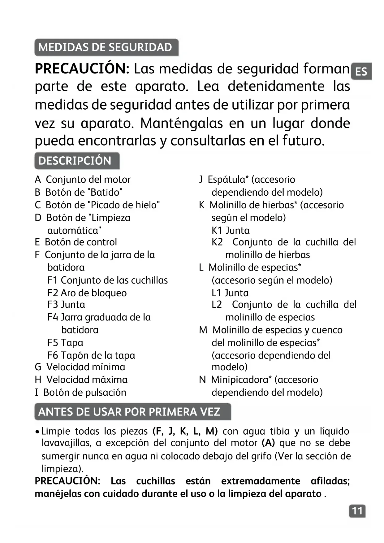 A Conjunto del motor B Botón de "Batido" C Botón de "Picado de hielo" D Botón de "Limpieza automática" E Botón de control F Conjunto de la jarra de la batidora F1 Conjunto de las cuchillas F2 Aro de bloqueo F3 Junta F4 Jarra graduada de la batidora F5 Tapa F6 Tapón de la tapa G Velocidad mínima H Velocidad máxima I Botón de pulsación J Espátula* (accesorio dependiendo del modelo) K Molinillo de hierbas* (accesorio según el modelo) K1 Junta K2 Conjunto de la cuchilla del molinillo de hierbas L Molinillo de especias* (accesorio según el modelo) L1 Junta L2 Conjunto de la cuchilla del molinillo de especias M Molinillo de especias y cuenco del molinillo de especias* (accesorio dependiendo del modelo) N Minipicadora* (accesorio dependiendo del modelo) PRECAUCIÓN: Las medidas de seguridad forman parte de este aparato. Lea detenidamente las medidas de seguridad antes de utilizar por primera vez su aparato. Manténgalas en un lugar donde pueda encontrarlas y consultarlas en el futuro.