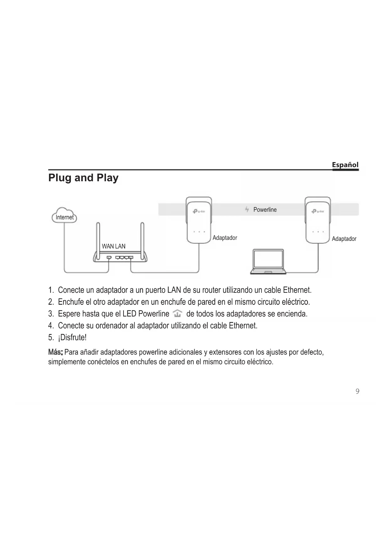 Más: Para añadir adaptadores powerline adicionales y extensores con los ajustes por defecto, simplemente conéctelos en enchufes de pared en el mismo circuito eléctrico. Internet WAN LAN Adaptador Adaptador PowerlineEspañol