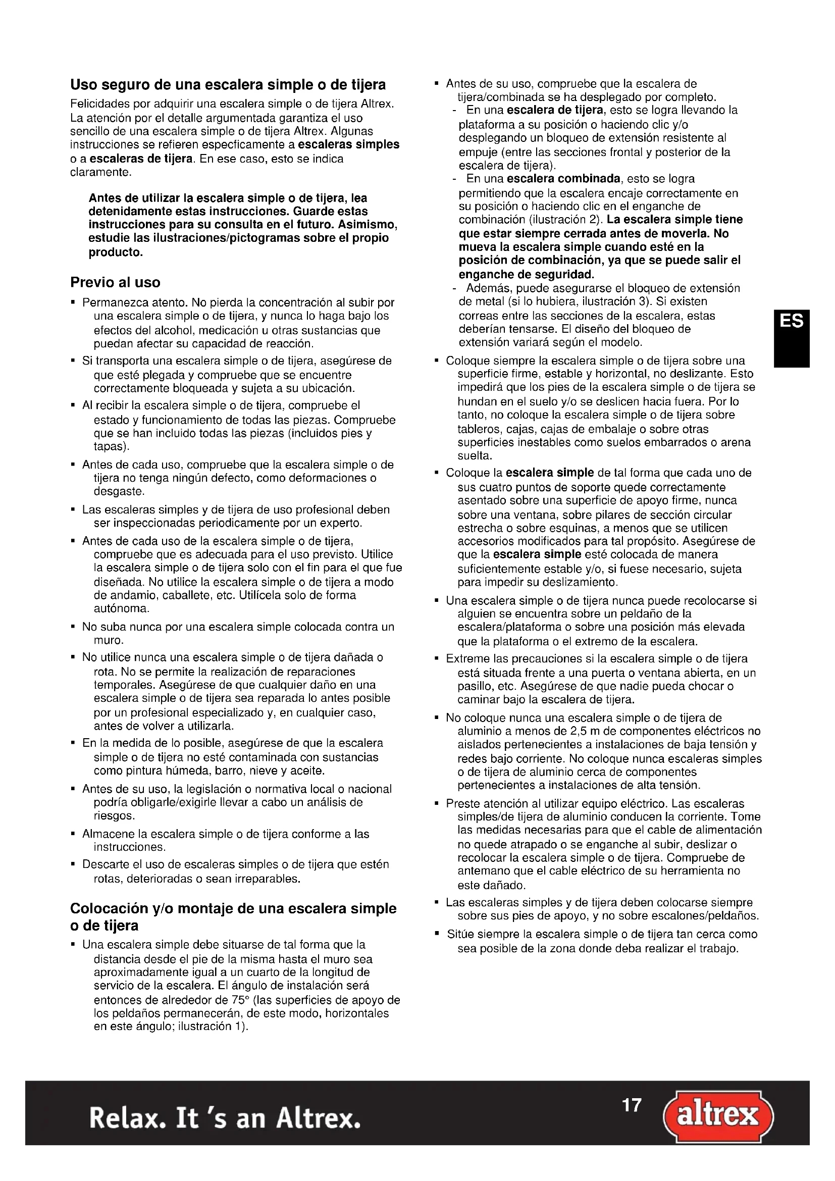 Uso seguro de una escalera simple o de tijera Felicidades por adquirir una escalera simple o de tijera Altrex. La atención por el detalle argumentada garantiza el uso sencillo de una escalera simple o de tijera Altrex. Algunas instrucciones se refieren especficamente a escaleras simples o a escaleras de tijera. En ese caso, esto se indica claramente. Antes de utilizar la escalera simple o de tijera, lea detenidamente estas instrucciones. Guarde estas instrucciones para su consulta en el futuro. Asimismo, estudie las ilustraciones/pictogramas sobre el propio producto. Previo al uso Permanezca atento. No pierda la concentración al subir por una escalera simple o de tijera, y nunca lo haga bajo los efectos del alcohol, medicación u otras sustancias que puedan afectar su capacidad de reacción. Si transporta una escalera simple o de tijera, asegúrese de que esté plegada y compruebe que se encuentre correctamente bloqueada y sujeta a su ubicación. Al recibir la escalera simple o de tijera, compruebe el estado y funcionamiento de todas las piezas. Compruebe que se han incluido todas las piezas (incluidos pies y tapas). Antes de cada uso, compruebe que la escalera simple o de tijera no tenga ningún defecto, como deformaciones o desgaste. Las escaleras simples y de tijera de uso profesional deben ser inspeccionadas periodicamente por un experto. Antes de cada uso de la escalera simple o de tijera, compruebe que es adecuada para el uso previsto. Utilice la escalera simple o de tijera solo con el fin para el que fue diseñada. No utilice la escalera simple o de tijera a modo de andamio, caballete, etc. Utilícela solo de forma autónoma. No suba nunca por una escalera simple colocada contra un muro. No utilice nunca una escalera simple o de tijera dañada o rota. No se permite la realización de reparaciones temporales. Asegúrese de que cualquier daño en una escalera simple o de tijera sea reparada lo antes posible por un profesional especializado y, en cualquier caso, antes de volver a utilizarla. En la medida de lo posible, asegúrese de que la escalera simple o de tijera no esté contaminada con sustancias como pintura húmeda, barro, nieve y aceite. Antes de su uso, la legislación o normativa local o nacional podría obligarle/exigirle llevar a cabo un análisis de riesgos. Almacene la escalera simple o de tijera conforme a las instrucciones. Descarte el uso de escaleras simples o de tijera que estén rotas, deterioradas o sean irreparables. Colocación y/o montaje de una escalera simple o de tijera Una escalera simple debe situarse de tal forma que la distancia desde el pie de la misma hasta el muro sea aproximadamente igual a un cuarto de la longitud de servicio de la escalera. El ángulo de instalación será entonces de alrededor de 75° (las superficies de apoyo de los peldaños permanecerán, de este modo, horizontales en este ángulo; ilustración 1).