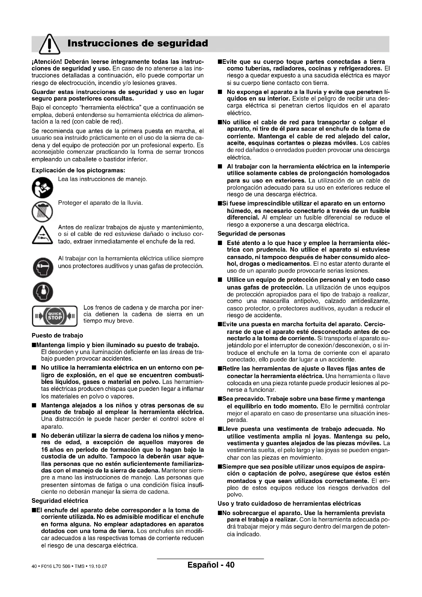 Sous réserve de modifications Elimination de déchets Service après-vente et assistance des clients Déclaration de conformité F016 L70 506 - Titel.book Seite 39 Dienstag, 23. Oktober 2007 1:28 13 39 • F016 L70 506 • TMS • 19.10.07Español - 40 ¡Atención! Deberán leerse íntegramente todas las instruc- ciones de seguridad y uso. En caso de no atenerse a las ins- trucciones detalladas a continuación, ello puede comportar un riesgo de electrocución, incendio y/o lesiones graves. Guardar estas instrucciones de seguridad y uso en lugar seguro para posteriores consultas. Bajo el concepto “herramienta eléctrica” que a continuación se emplea, deberá entenderse su herramienta eléctrica de alimen- tación a la red (con cable de red). Se recomienda que antes de la primera puesta en marcha, el usuario sea instruido prácticamente en el uso de la sierra de ca- dena y del equipo de protección por un profesional experto. Es aconsejable comenzar practicando la forma de serrar troncos empleando un caballete o bastidor inferior. Explicación de los pictogramas: Lea las instrucciones de manejo. Proteger el aparato de la lluvia. Antes de realizar trabajos de ajuste y mantenimiento, o si el cable de red estuviese dañado o incluso cor- tado, extraer inmediatamente el enchufe de la red. Al trabajar con la herramienta eléctrica utilice siempre unos protectores auditivos y unas gafas de protección. Los frenos de cadena y de marcha por iner- cia detienen la cadena de sierra en un tiempo muy breve. Puesto de trabajo ■ Mantenga limpio y bien iluminado su puesto de trabajo. El desorden y una iluminación deficiente en las áreas de tra- bajo pueden provocar accidentes. ■ No utilice la herramienta eléctrica en un entorno con pe- ligro de explosión, en el que se encuentren combusti- bles líquidos, gases o material en polvo. Las herramien- tas eléctricas producen chispas que pueden llegar a inflamar los materiales en polvo o vapores. ■ Mantenga alejados a los niños y otras personas de su puesto de trabajo al emplear la herramienta eléctrica. Una distracción le puede hacer perder el control sobre el aparato. ■ No deberán utilizar la sierra de cadena los niños y meno- res de edad, a excepción de aquellos mayores de 16 años en periodo de formación que lo hagan bajo la custodia de un adulto. Tampoco la deberán usar aque- llas personas que no estén suficientemente familiariza- das con el manejo de la sierra de cadena. Mantener siem- pre a mano las instrucciones de manejo. Las personas que presenten síntomas de fatiga o una condición física insufi- ciente no deberán manejar la sierra de cadena. Seguridad eléctrica ■ El enchufe del aparato debe corresponder a la toma de corriente utilizada. No es admisible modificar el enchufe en forma alguna. No emplear adaptadores en aparatos dotados con una toma de tierra. Los enchufes sin modifi- car adecuados a las respectivas tomas de corriente reducen el riesgo de una descarga eléctrica. ■ Evite que su cuerpo toque partes conectadas a tierra como tuberías, radiadores, cocinas y refrigeradores. El riesgo a quedar expuesto a una sacudida eléctrica es mayor si su cuerpo tiene contacto con tierra. ■ No exponga el aparato a la lluvia y evite que penetren lí- quidos en su interior. Existe el peligro de recibir una des- carga eléctrica si penetran ciertos líquidos en el aparato eléctrico. ■ No utilice el cable de red para transportar o colgar el aparato, ni tire de él para sacar el enchufe de la toma de corriente. Mantenga el cable de red alejado del calor, aceite, esquinas cortantes o piezas móviles. Los cables de red dañados o enredados pueden provocar una descarga eléctrica. ■ Al trabajar con la herramienta eléctrica en la intemperie utilice solamente cables de prolongación homologados para su uso en exteriores. La utilización de un cable de prolongación adecuado para su uso en exteriores reduce el riesgo de una descarga eléctrica. ■ Si fuese imprescindible utilizar el aparato en un entorno húmedo, es necesario conectarlo a través de un fusible diferencial. Al emplear un fusible diferencial se reduce el riesgo a exponerse a una descarga eléctrica. Seguridad de personas ■ Esté atento a lo que hace y emplee la herramienta eléc- trica con prudencia. No utilice el aparato si estuviese cansado, ni tampoco después de haber consumido alco- hol, drogas o medicamentos. El no estar atento durante el uso de un aparato puede provocarle serias lesiones. ■ Utilice un equipo de protección personal y en todo caso unas gafas de protección. La utilización de unos equipos de protección apropiados para el tipo de trabajo a realizar, como una mascarilla antipolvo, calzado antideslizante, casco protector, o protectores auditivos, ayudan a reducir el riesgo de accidente. ■ Evite una puesta en marcha fortuita del aparato. Cercio- rarse de que el aparato esté desconectado antes de co- nectarlo a la toma de corriente. Si transporta el aparato su- jetándolo por el interruptor de conexión/desconexión, o si in- troduce el enchufe en la toma de corriente con el aparato conectado, ello puede dar lugar a un accidente. ■ Retire las herramientas de ajuste o llaves fijas antes de conectar la herramienta eléctrica. Una herramienta o llave colocada en una pieza rotante puede producir lesiones al po- nerse a funcionar. ■ Sea precavido. Trabaje sobre una base firme y mantenga el equilibrio en todo momento. Ello le permitirá controlar mejor el aparato en caso de presentarse una situación ines- perada. ■ Lleve puesta una vestimenta de trabajo adecuada. No utilice vestimenta amplia ni joyas. Mantenga su pelo, vestimenta y guantes alejados de las piezas móviles. La vestimenta suelta, el pelo largo y las joyas se pueden engan- char con las piezas en movimiento. ■ Siempre que sea posible utilizar unos equipos de aspira- ción o captación de polvo, asegúrese que éstos estén montados y que sean utilizados correctamente.