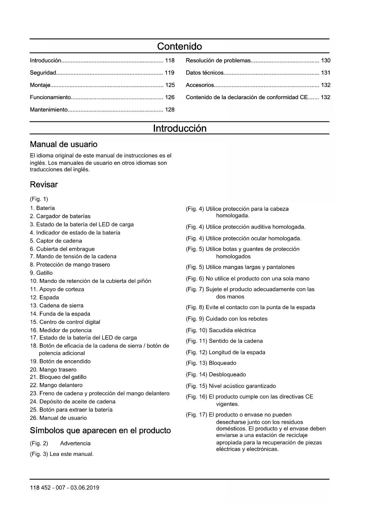 Símbolos que aparecen en el producto (Fig. 2) Advertencia (Fig. 3) Lea este manual. (Fig. 4) Utilice protección para la cabeza homologada. (Fig. 4) Utilice protección auditiva homologada. (Fig. 4) Utilice protección ocular homologada. (Fig. 5) Utilice botas y guantes de protección homologados (Fig. 5) Utilice mangas largas y pantalones (Fig. 6) No utilice el producto con una sola mano (Fig. 7) Sujete el producto adecuadamente con las dos manos (Fig. 8) Evite el contacto con la punta de la espada (Fig. 9) Cuidado con los rebotes (Fig. 10) Sacudida eléctrica (Fig. 11) Sentido de la cadena (Fig. 12) Longitud de la espada (Fig. 13) Bloqueado (Fig. 14) Desbloqueado (Fig. 15) Nivel acústico garantizado (Fig. 16) El producto cumple con las directivas CE vigentes. (Fig. 17) El producto o envase no pueden desecharse junto con los residuos domésticos. El producto y el envase deben enviarse a una estación de reciclaje apropiada para la recuperación de piezas eléctricas y electrónicas. 118 452 - 007 - 03.06.2019(Fig. 18) No deje, almacene ni utilice el producto con lluvia ni en condiciones húmedas. (Fig. 19) Reciclado Nota: Los demás símbolos/etiquetas que aparecen en el producto corresponden a requisitos de homologación específicos en otras zonas comerciales. Responsabilidad sobre el producto Como se estipula en las leyes de responsabilidad del producto, no nos hacemos responsables de los daños y perjuicios causados por nuestro producto si: