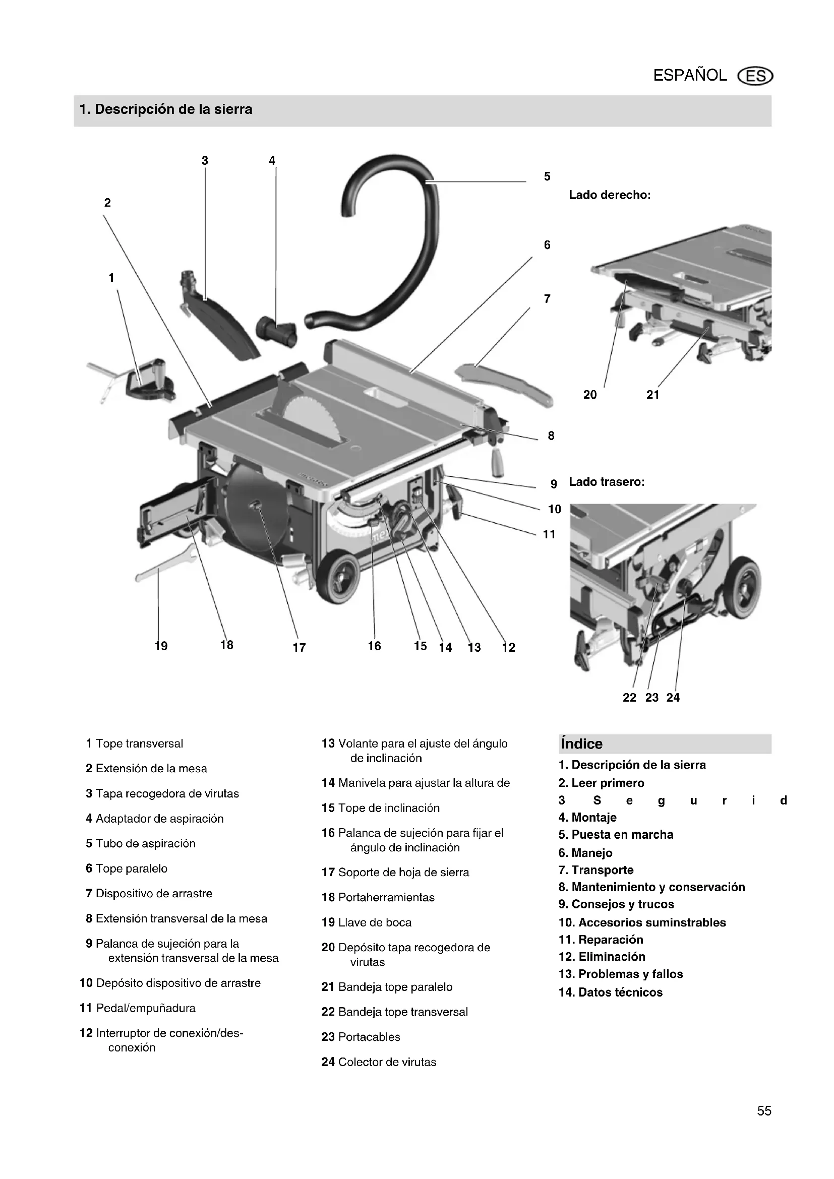 1 Tope transversal 2 Extensión de la mesa 3 Tapa recogedora de virutas 4 Adaptador de aspiración 5 Tubo de aspiración 6 Tope paralelo 7 Dispositivo de arrastre 8 Extensión transversal de la mesa 9 Palanca de sujeción para la extensión transversal de la mesa 10 Depósito dispositivo de arrastre 11 Pedal/empuñadura 12 Interruptor de conexión/des- conexión 13 Volante para el ajuste del ángulo de inclinación 14 Manivela para ajustar la altura de 15 Tope de inclinación 16 Palanca de sujeción para fijar el ángulo de inclinación 17 Soporte de hoja de sierra 18 Portaherramientas 19 Llave de boca 20 Depósito tapa recogedora de virutas 21 Bandeja tope paralelo 22 Bandeja tope transversal 23 Portacables 24 Colector de virutas Índice 17028992_10_TS254_ES.fm Manual original ESPAÑOLESPAÑOL