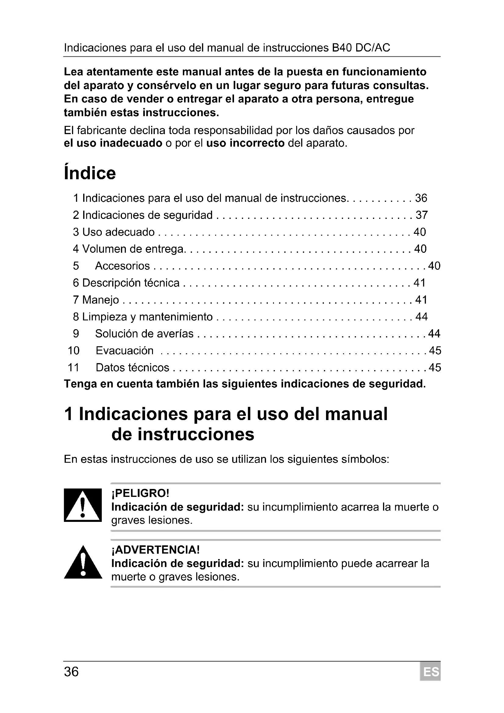¡ADVERTENCIA! Indicación de seguridad: su incumplimiento puede acarrear la muerte o graves lesiones. _B40.book Seite 36 Mittwoch, 20. April 2011 3:28 15ES B40 DC/AC Indicaciones de seguridad
