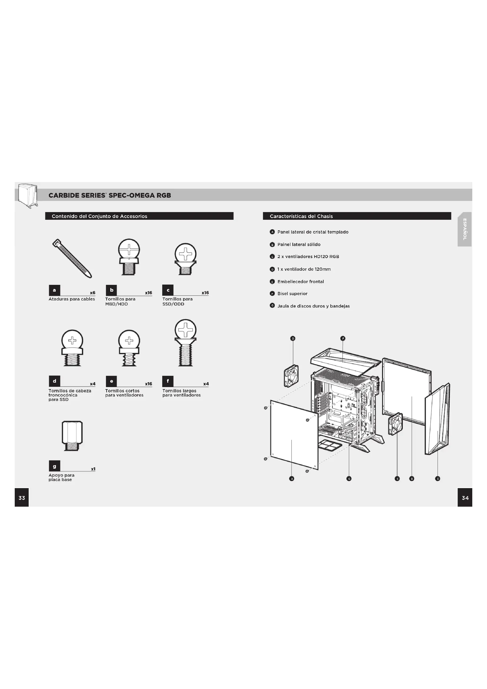 x16 x16 Características del Chasis Contenido del Conjunto de Accesorios Ataduras para cables Apoyo para placa base Tornillos cortos para ventiladores Tornillos de cabeza troncocónica para SSD Tornillos largos para ventiladores Tornillos para MBD/HDD Tornillos para SSD/ODD Panel lateral de cristal templado Painel lateral sólido 2 x ventiladores HD120 RGB 1 x ventilador de 120mm Embellecedor frontal Bisel superior Jaula de discos duros y bandejasCARBIDE SERIES