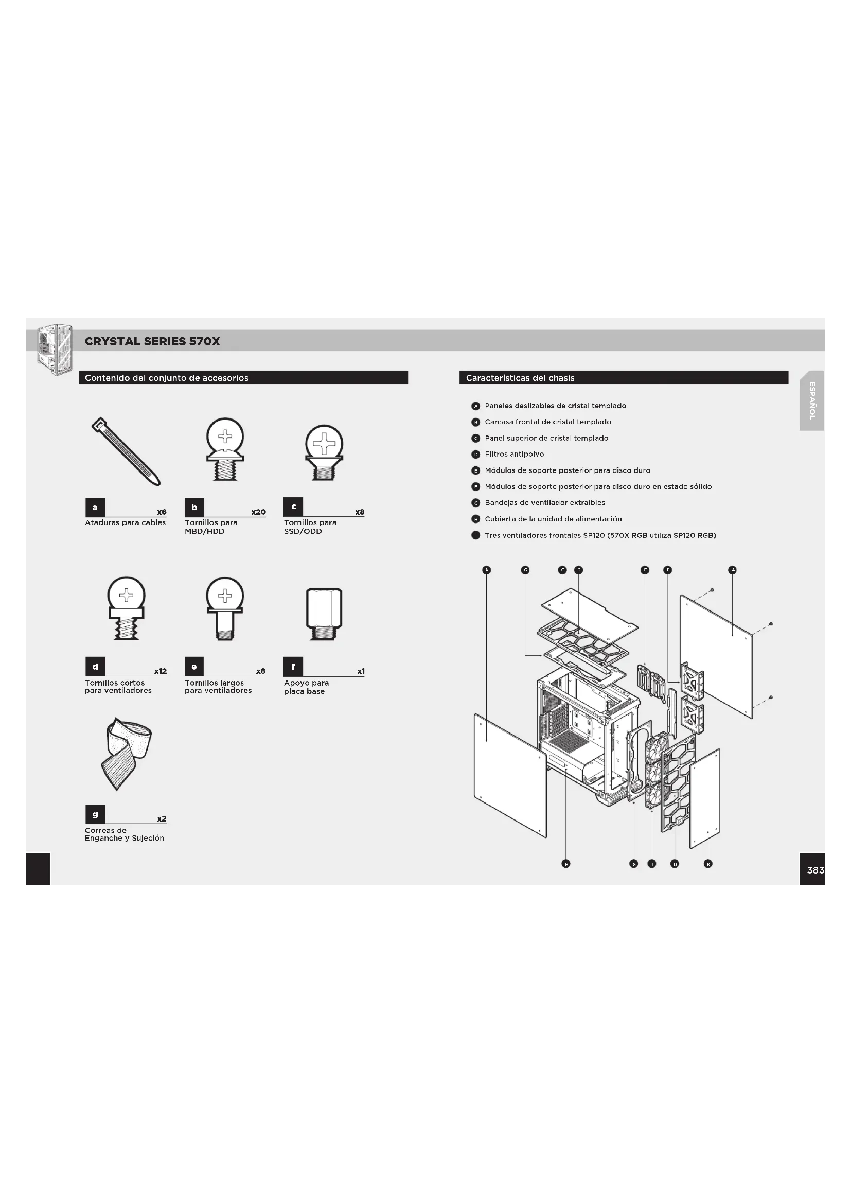 Tornillos para SSD/ODD Paneles deslizables de cristal templado Carcasa frontal de cristal templado Panel superior de cristal templado Filtros antipolvo Módulos de soporte posterior para disco duro Módulos de soporte posterior para disco duro en estado sólido Bandejas de ventilador extraíbles Cubierta de la unidad de alimentación Tres ventiladores frontales SP120 (570X RGB utiliza SP120 RGB)