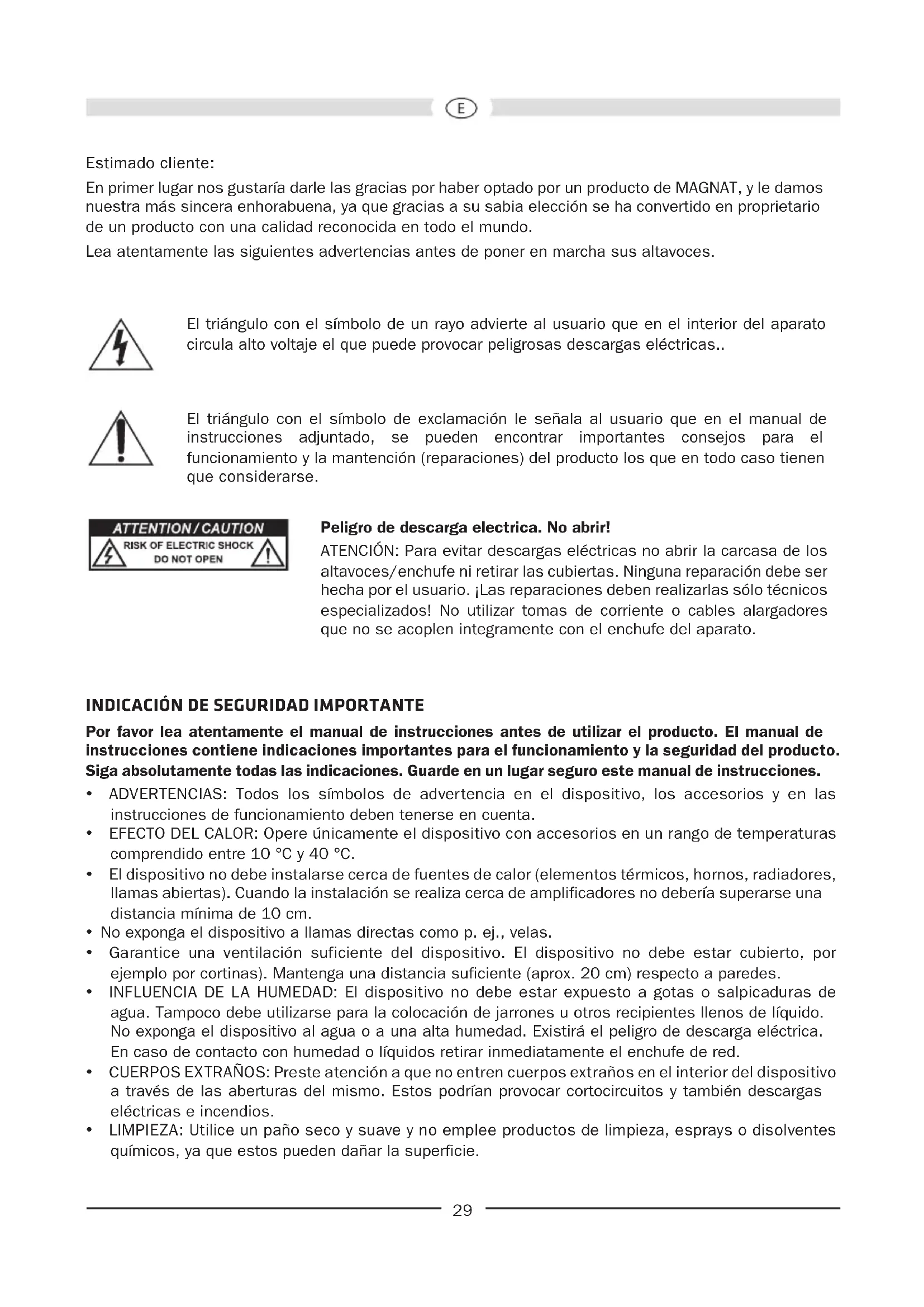 Estimado cliente: En primer lugar nos gustaría darle las gracias por haber optado por un producto de MAGNAT, y le damos nuestra más sincera enhorabuena, ya que gracias a su sabia elección se ha convertido en proprietario de un producto con una calidad reconocida en todo el mundo. Lea atentamente las siguientes advertencias antes de poner en marcha sus altavoces. El triángulo con el símbolo de un rayo advierte al usuario que en el interior del aparato circula alto voltaje el que puede provocar peligrosas descargas eléctricas.. El triángulo con el símbolo de exclamación le señala al usuario que en el manual de instrucciones adjuntado, se pueden encontrar importantes consejos para el funcionamiento y la mantención (reparaciones) del producto los que en todo caso tienen que considerarse. Peligro de descarga electrica. No abrir! ATENCIÓN: Para evitar descargas eléctricas no abrir la carcasa de los altavoces/enchufe ni retirar las cubiertas. Ninguna reparación debe ser hecha por el usuario. ¡Las reparaciones deben realizarlas sólo técnicos especializados! No utilizar tomas de corriente o cables alargadores que no se acoplen integramente con el enchufe del aparato.