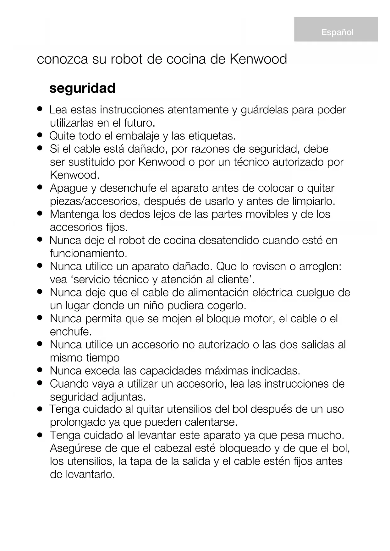 Tenga cuidado al levantar este aparato ya que pesa mucho. Asegúrese de que el cabezal esté bloqueado y de que el bol, los utensilios, la tapa de la salida y el cable estén fijos antes de levantarlo. conozca su robot de cocina de Kenwood Español68