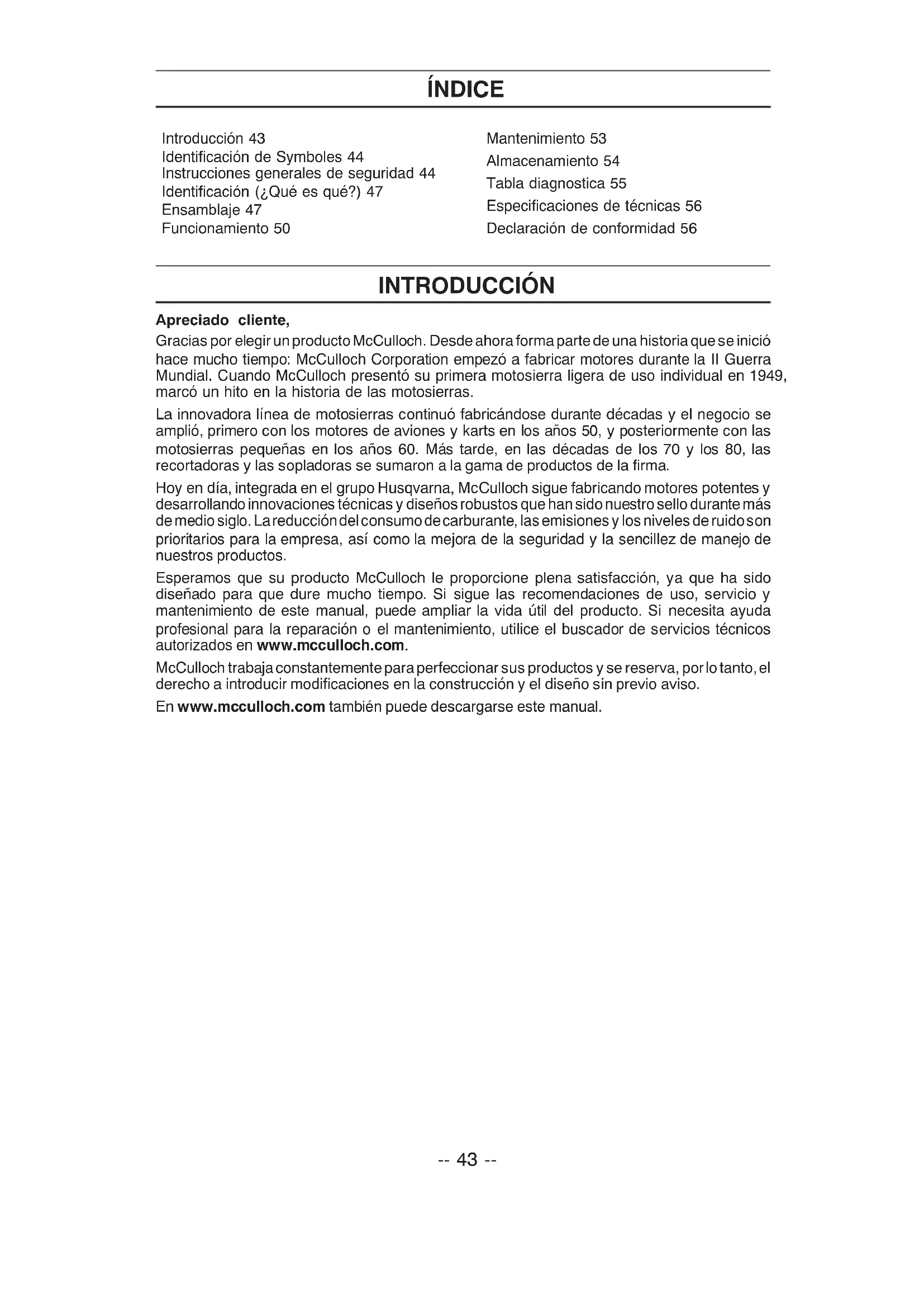 Gracias por elegir un producto McCulloch. De sde ahora forma parte de una historia que se inició hacer mucho tiempo: McCulloch Corporation empezo a fabricar motores durante la II Guerra Mundial. Cuando McCulloch presentó su primera motosierra ligera de uso individual en 1949, marcó un hito en la historia de las motosierras.