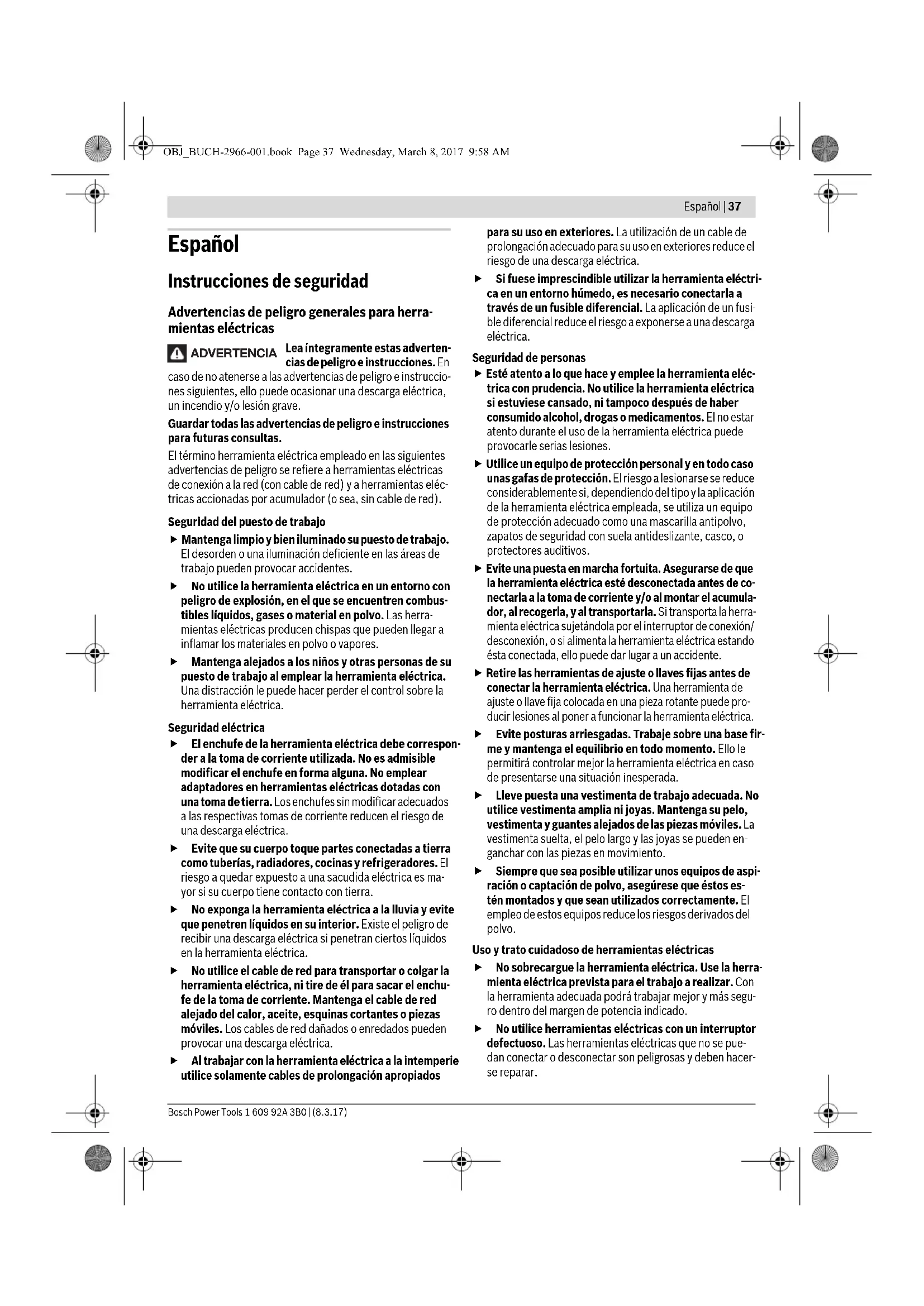 - potencia limitada a temperaturas <0 °CDatos técnicos determinados con el tipo de acumulador suministrado. OBJ_BUCH-2966-001.book Page 39 Wednesday, March 8, 2017 9:58 AM40 | Español 1 609 92A 3B0 | (8.3.17) Bosch Power Tools Trabajos con empuñadura adicional Nivel total de vibraciones a
