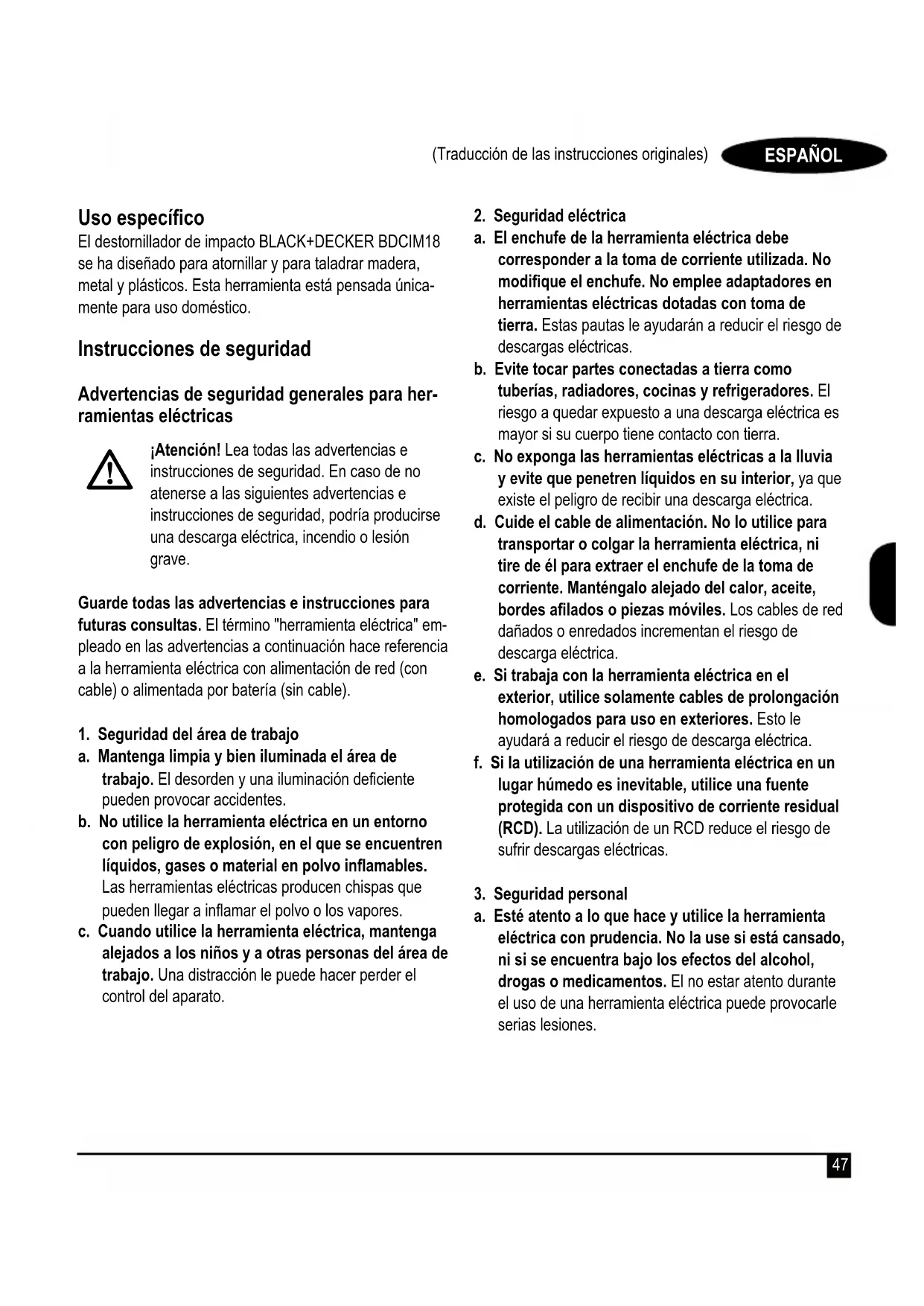 (Traducción de las instrucciones originales) ESPAÑOL (Vertaling van de originele instructies) Uso especíco El destornillador de impacto BLACK+DECKER BDCIM18 se ha diseñado para atornillar y para taladrar madera, metal y plásticos. Esta herramienta está pensada única- mente para uso doméstico. Instrucciones de seguridad Advertencias de seguridad generales para her- ramientas eléctricas