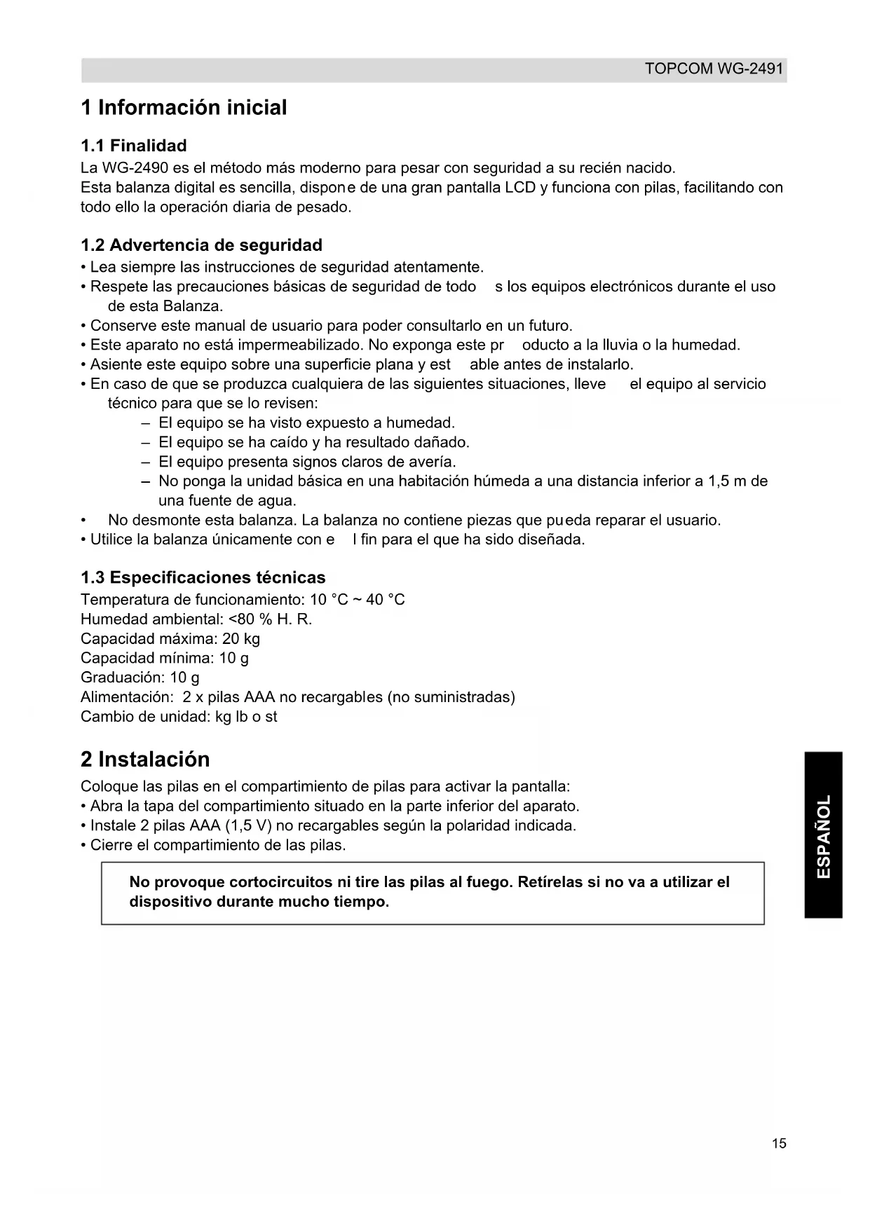O-Ld Batería baja, reemplace las pilas. Sobrecarga. El peso del bebé es superior a 20 kg. 6 Limpieza Limpie la balanza con un trapo ligeramente humedecido o con un trapo antiestático. No use nunca agentes limpiadores ni disolventes abrasivos. 7 Eliminación del dispositivo (medio ambiente) Al final de su vida útil este producto no debe ser desechado en un contenedor normal, sino en un punto de recogida destinado al reciclaje de equipos eléctrico s y electrónicos. Así lo indica el símbolo en el producto, en el manual de usuario y/o en la caja. Si usted los lleva a un punto de reciclaje, alg unos de los materiales del producto podrán reutilizarse. La reutilización de algunas de las piezas o materias primas de estos productos17 ESPAÑOL TOPCOM WG-2491 supone una importante contribución a la protección del medio ambiente. Si necesita más información sobre los puntos de reciclaje existentes en su zona, póngase en contacto con las autoridades locales correspondientes. Deben retirarse las pilas antes de eliminar el dispositivo. Elimine las pilas sin contaminar el medio ambiente de acuerdo con la normativa de su país. 8 Garantía de Topcom