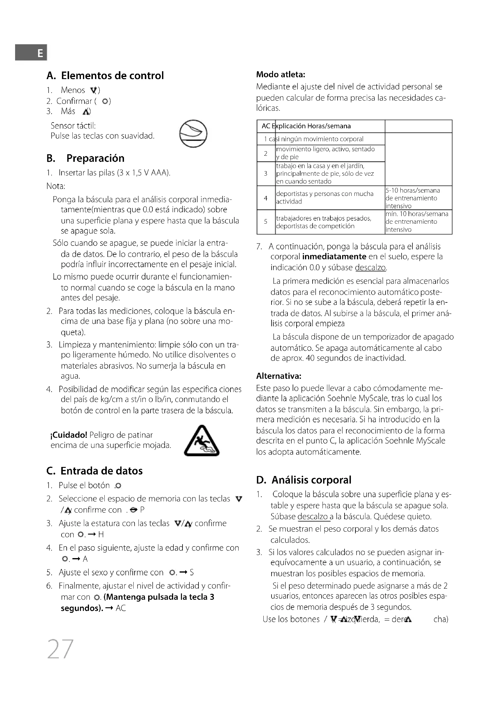 ciones del país de kg/cm a st/in o lb/in, conmutando el botón de control en la parte trasera de la báscula. ¡Cuidado! Peligro de patinar encima de una superficie mojada. C. Entrada de datos
