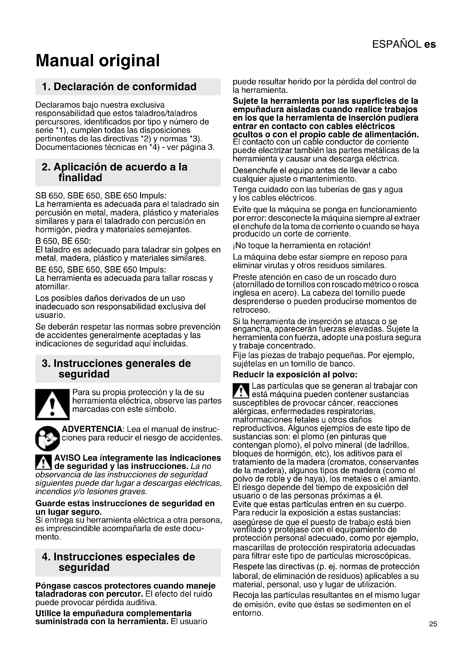 Manual original Declaramos bajo nuestra exclusiva responsabilidad que estos taladros/taladros percursores, identificados por tipo y número de serie *1), cumplen todas las disposiciones pertinentes de las directivas *2) y normas *3). Documentaciones técnicas en *4) - ver página 3. SB 650, SBE 650, SBE 650 Impuls: La herramienta es adecuada para el taladrado sin percusión en metal, madera, plástico y materiales similares y para el taladrado con percusión en hormigón, piedra y materiales semejantes. B 650, BE 650: El taladro es adecuado para taladrar sin golpes en metal, madera, plástico y materiales similares. BE 650, SBE 650, SBE 650 Impuls: La herramienta es adecuada para tallar roscas y atornillar. Los posibles daños derivados de un uso inadecuado son responsabilidad exclusiva del usuario. Se deberán respetar las normas sobre prevención de accidentes generalmente aceptadas y las indicaciones de seguridad aquí incluidas. Para su propia protección y la de su herramienta eléctrica, observe las partes marcadas con este símbolo. ADVERTENCIA: Lea el manual de instruc- ciones para reducir el riesgo de accidentes. AVISO Lea íntegramente las indicaciones de seguridad y las instrucciones. La no observancia de las instrucciones de seguridad siguientes puede dar lugar a descargas eléctricas, incendios y/o lesiones graves. Guarde estas instrucciones de seguridad en un lugar seguro. Si entrega su herramienta eléctrica a otra persona, es imprescindible acompañarla de este docu- mento. Póngase cascos protectores cuando maneje taladradoras con percutor. El efecto del ruido puede provocar pérdida auditiva. Utilice la empuñadura complementaria suministrada con la herramienta. El usuario puede resultar herido por la pérdida del control de la herramienta. Sujete la herramienta por las superficies de la empuñadura aisladas cuando realice trabajos en los que la herramienta de inserción pudiera entrar en contacto con cables eléctricos ocultos o con el propio cable de alimentación. El contacto con un cable conductor de corriente puede electrizar también las partes metálicas de la herramienta y causar una descarga eléctrica. Desenchufe el equipo antes de llevar a cabo cualquier ajuste o mantenimiento. Tenga cuidado con las tuberías de gas y agua y los cables eléctricos. Evite que la máquina se ponga en funcionamiento por error: desconecte la máquina siempre al extraer el enchufe de la toma de corriente o cuando se haya producido un corte de corriente. ¡No toque la herramienta en rotación! La máquina debe estar siempre en reposo para eliminar virutas y otros residuos similares. Preste atención en caso de un roscado duro (atornillado de tornillos con roscado métrico o rosca inglesa en acero). La cabeza del tornillo puede desprenderse o pueden producirse momentos de retroceso. Si la herramienta de inserción se atasca o se engancha, aparecerán fuerzas elevadas. Sujete la herramienta con fuerza, adopte una postura segura y trabaje concentrado. Fije las piezas de trabajo pequeñas. Por ejemplo, sujételas en un tornillo de banco. Reducir la exposición al polvo: Las partículas que se generan al trabajar con está máquina pueden contener sustancias susceptibles de provocar cáncer, reacciones alérgicas, enfermedades respiratorias, malformaciones fetales u otros daños reproductivos. Algunos ejemplos de este tipo de sustancias son: el plomo (en pinturas que contengan plomo), el polvo mineral (de ladrillos, bloques de hormigón, etc), los aditivos para el tratamiento de la madera (cromatos, conservantes de la madera), algunos tipos de madera (como el polvo de roble y de haya), los metales o el amianto. El riesgo depende del tiempo de exposición del usuario o de las personas próximas a él. Evite que estas partículas entren en su cuerpo. Para