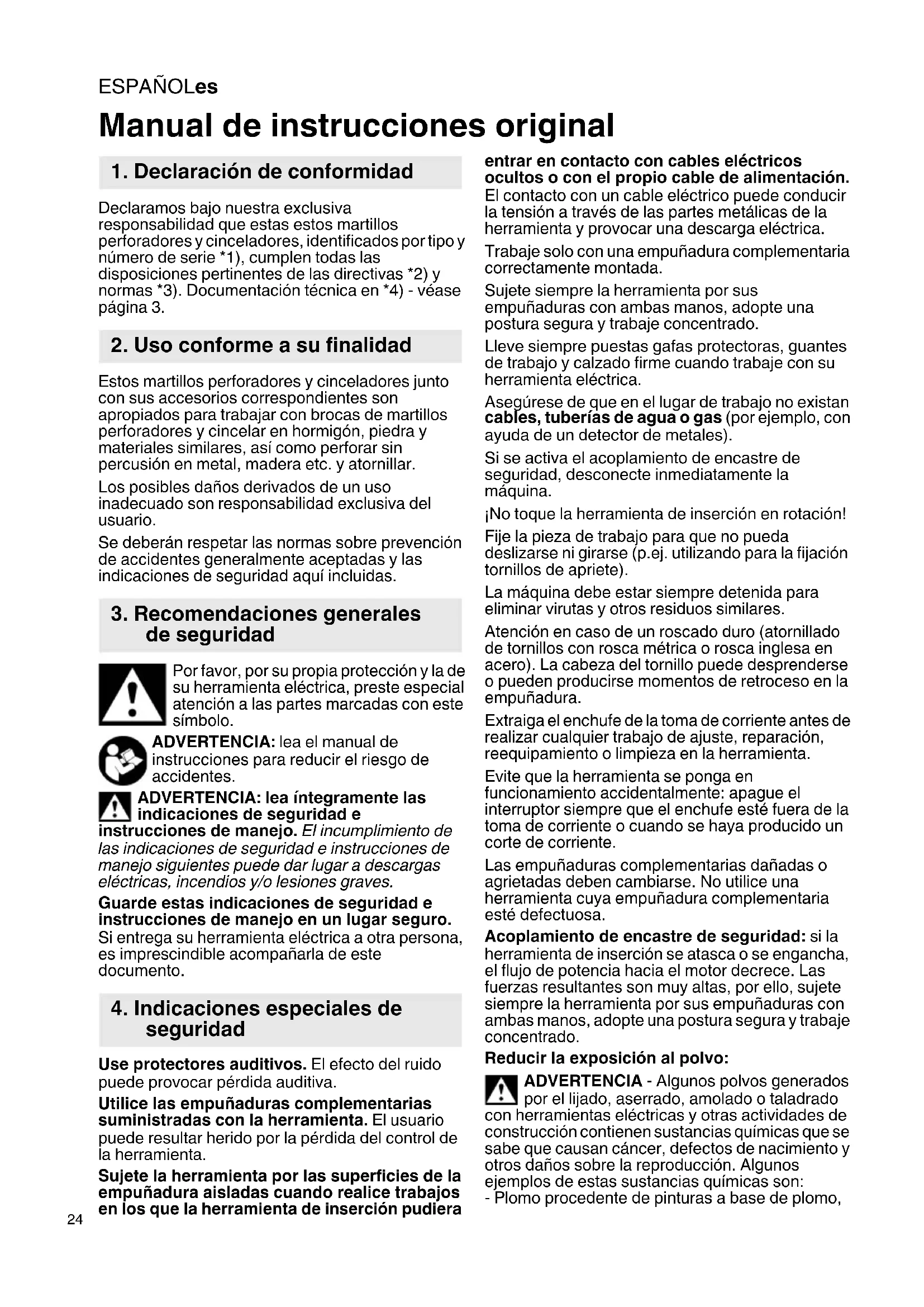 Declaramos bajo nuestra exclusiva responsabilidad que estas estos martillos perforadores y cinceladores, identificados por tipo y número de serie *1), cumplen todas las disposiciones pertinentes de las directivas *2) y normas *3). Documentación técnica en *4) - véase página 3. Estos martillos perforadores y cinceladores junto con sus accesorios correspondientes son apropiados para trabajar con brocas de martillos perforadores y cincelar en hormigón, piedra y materiales similares, así como perforar sin percusión en metal, madera etc. y atornillar. Los posibles daños derivados de un uso inadecuado son responsabilidad exclusiva del usuario. Se deberán respetar las normas sobre prevención de accidentes generalmente aceptadas y las indicaciones de seguridad aquí incluidas. Por favor, por su propia protección y la de su herramienta eléctrica, preste especial atención a las partes marcadas con este símbolo. ADVERTENCIA: lea el manual de instrucciones para reducir el riesgo de accidentes. ADVERTENCIA: lea íntegramente las indicaciones de seguridad e instrucciones de manejo. El incumplimiento de las indicaciones de seguridad e instrucciones de manejo siguientes puede dar lugar a descargas eléctricas, incendios y/o lesiones graves. Guarde estas indicaciones de seguridad e instrucciones de manejo en un lugar seguro. Si entrega su herramienta eléctrica a otra persona, es imprescindible acompañarla de este documento. Use protectores auditivos. El efecto del ruido puede provocar pérdida auditiva. Utilice las empuñaduras complementarias suministradas con la herramienta. El usuario puede resultar herido por la pérdida del control de la herramienta. Sujete la herramienta por las superficies de la empuñadura aisladas cuando realice trabajos en los que la herramienta de inserción pudiera entrar en contacto con cables eléctricos ocultos o con el propio cable de alimentación. El contacto con un cable eléctrico puede conducir la tensión a través de las partes metálicas de la herramienta y provocar una descarga eléctrica. Trabaje solo con una empuñadura complementaria correctamente montada. Sujete siempre la herramienta por sus empuñaduras con ambas manos, adopte una postura segura y trabaje concentrado. Lleve siempre puestas gafas protectoras, guantes de trabajo y calzado firme cuando trabaje con su herramienta eléctrica. Asegúrese de que en el lugar de trabajo no existan cables, tuberías de agua o gas (por ejemplo, con ayuda de un detector de metales). Si se activa el acoplamiento de encastre de seguridad, desconecte inmediatamente la máquina. ¡No toque la herramienta de inserción en rotación! Fije la pieza de trabajo para que no pueda deslizarse ni girarse (p.ej. utilizando para la fijación tornillos de apriete). La máquina debe estar siempre detenida para eliminar virutas y otros residuos similares. Atención en caso de un roscado duro (atornillado de tornillos con rosca métrica o rosca inglesa en acero). La cabeza del tornillo puede desprenderse o pueden producirse momentos de retroceso en la empuñadura. Extraiga el enchufe de la toma de corriente antes de realizar cualquier trabajo de ajuste, reparación, reequipamiento o limpieza en la herramienta. Evite que la herramienta se ponga en funcionamiento accidentalmente: apague el interruptor siempre que el enchufe esté fuera de la toma de corriente o cuando se haya producido un corte de corriente. Las empuñaduras complementarias dañadas o agrietadas deben cambiarse. No utilice una herramienta cuya empuñadura complementaria esté defectuosa. Acoplamiento de encastre de seguridad: si la herramienta de inserción se atasca o se engancha, el flujo de potencia hacia el motor decrece. Las fuerzas resultantes son muy altas, por ello, sujete siempre la herramienta por sus empuñaduras con ambas manos, adopte una postura segura y trabaje concentrado. Reducir la exposición al polvo: ADVERTENCIA - Algunos polvos generados por el lijado, aserrado, amolado o taladrado con herramientas eléctricas y otras actividades de construcción contienen sustancias químicas que se sabe que causan cáncer, defectos de nacimiento y otros daños sobre la reproducción. Algunos ejemplos de estas sustancias químicas son: - Plomo procedente de pinturas a base de plomo, Manual de instrucciones original