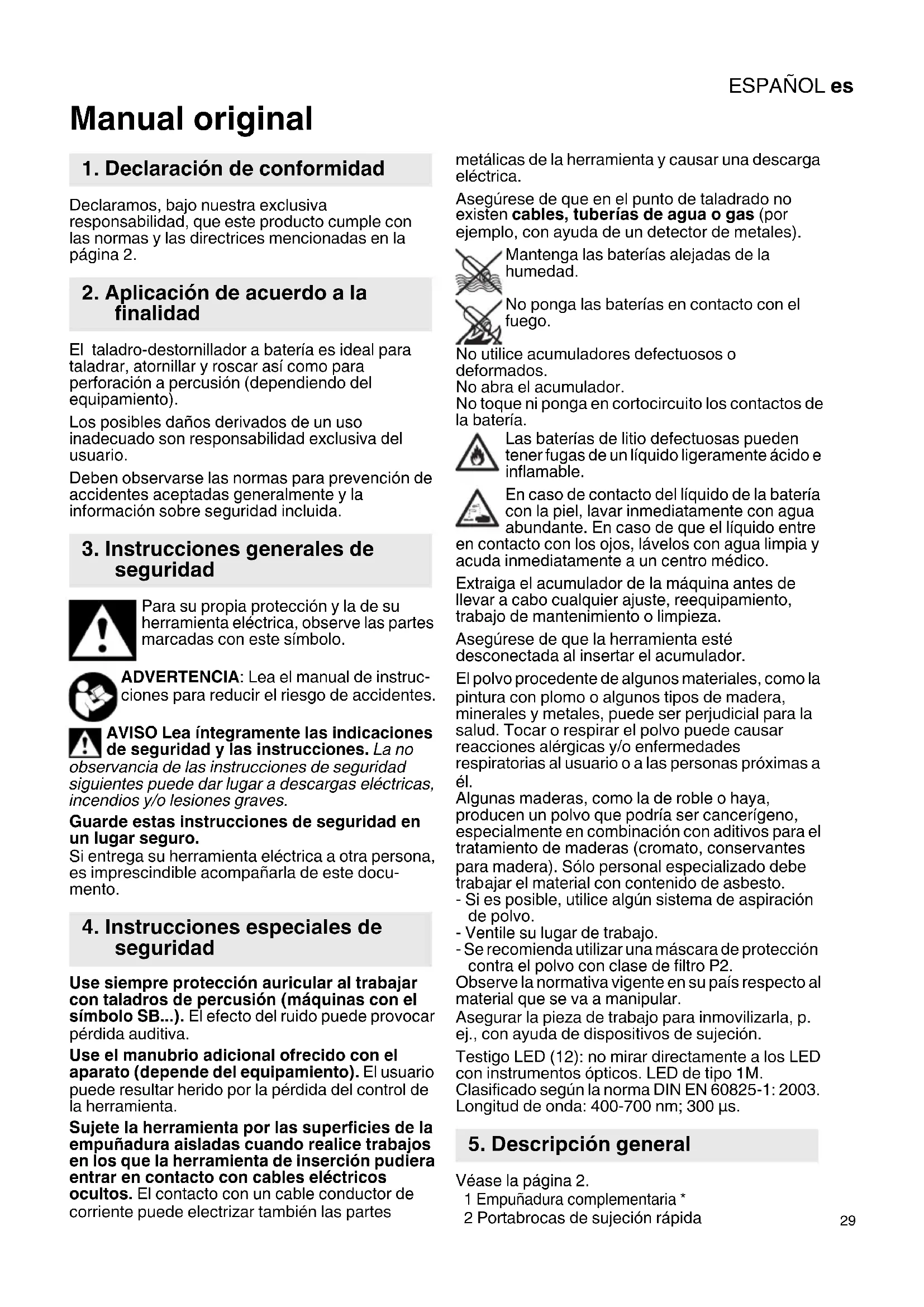 Manual original Declaramos, bajo nuestra exclusiva responsabilidad, que este producto cumple con las normas y las directrices mencionadas en la página 2. El taladro-destornillador a batería es ideal para taladrar, atornillar y roscar así como para perforación a percusión (dependiendo del equipamiento). Los posibles daños derivados de un uso inadecuado son responsabilidad exclusiva del usuario. Deben observarse las normas para prevención de accidentes aceptadas generalmente y la información sobre seguridad incluida. Para su propia protección y la de su herramienta eléctrica, observe las partes marcadas con este símbolo. ADVERTENCIA: Lea el manual de instruc- ciones para reducir el riesgo de accidentes. AVISO Lea íntegramente las indicaciones de seguridad y las instrucciones. La no observancia de las instrucciones de seguridad siguientes puede dar lugar a descargas eléctricas, incendios y/o lesiones graves. Guarde estas instrucciones de seguridad en un lugar seguro. Si entrega su herramienta eléctrica a otra persona, es imprescindible acompañarla de este docu- mento. Use siempre protección auricular al trabajar con taladros de percusión (máquinas con el símbolo SB...). El efecto del ruido puede provocar pérdida auditiva. Use el manubrio adicional ofrecido con el aparato (depende del equipamiento). El usuario puede resultar herido por la pérdida del control de la herramienta. Sujete la herramienta por las superficies de la empuñadura aisladas cuando realice trabajos en los que la herramienta de inserción pudiera entrar en contacto con cables eléctricos ocultos. El contacto con un cable conductor de corriente puede electrizar también las partes metálicas de la herramienta y causar una descarga eléctrica. Asegúrese de que en el punto de taladrado no existen cables, tuberías de agua o gas (por ejemplo, con ayuda de un detector de metales). Mantenga las baterías alejadas de la humedad. No ponga las baterías en contacto con el fuego. No utilice acumuladores defectuosos o deformados. No abra el acumulador. No toque ni ponga en cortocircuito los contactos de la batería. Las baterías de litio defectuosas pueden tener fugas de un líquido ligeramente ácido e inflamable. En caso de contacto del líquido de la batería con la piel, lavar inmediatamente con agua abundante. En caso de que el líquido entre en contacto con los ojos, lávelos con agua limpia y acuda inmediatamente a un centro médico. Extraiga el acumulador de la máquina antes de llevar a cabo cualquier ajuste, reequipamiento, trabajo de mantenimiento o limpieza. Asegúrese de que la herramienta esté desconectada al insertar el acumulador. El polvo procedente de algunos materiales, como la pintura con plomo o algunos tipos de madera, minerales y metales, puede ser perjudicial para la salud. Tocar o respirar el polvo puede causar reacciones alérgicas y/o enfermedades respiratorias al usuario o a las personas próximas a él. Algunas maderas, como la de roble o haya, producen un polvo que podría ser cancerígeno, especialmente en combinación con aditivos para el tratamiento de maderas (cromato, conservantes para madera). Sólo personal especializado debe trab ajar el material con contenido de asbesto. - Si es posible, utilice algún sistema de aspiración de polvo. - Ventile su lugar de trabajo. - Se recomienda utilizar una máscara de protección contra el polvo con clase de filtro P2. Observe la normativa vigente en su país respecto al material que se va a manipular. Asegurar la pieza de trabajo para inmovilizarla, p. ej., con ayuda de dispositivos de sujeción. Testigo LED (12): no mirar directamente a los LED con instrumentos ópticos. LED de tipo 1M. Clasificado según la norma DIN EN 60825-1: 2003. Longitud de onda: 400-700 nm; 300 µs. Véase la página 2. 1 Empuñadura complementaria * 2 Portabrocas de sujeción rápida