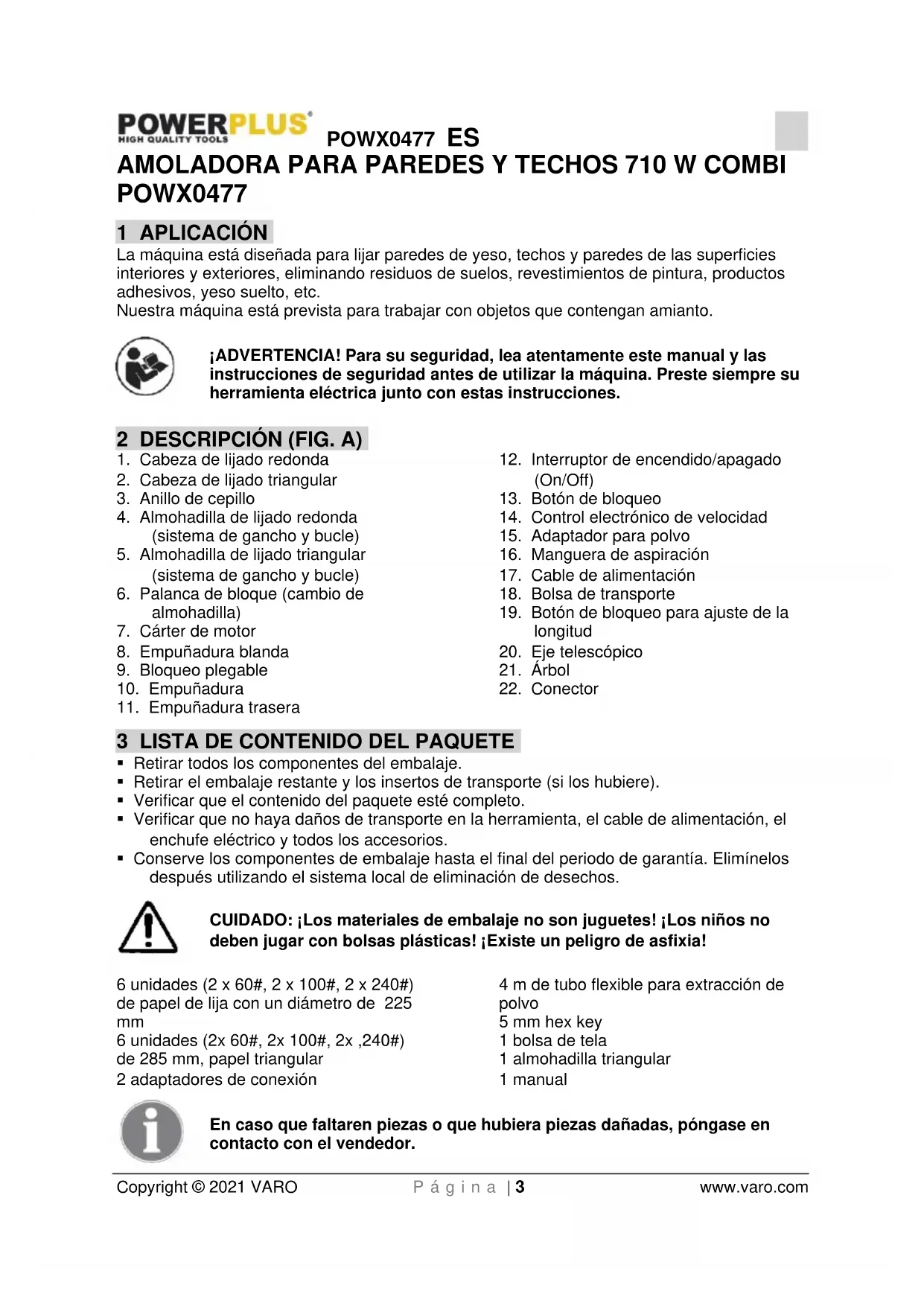 Copyright © 2021 VARO P á g i n a | 3 www.varo.com AMOLADORA PARA PAREDES Y TECHOS 710 W COMBI POWX0477 1 APLICACIÓN La máquina está diseñada para lijar paredes de yeso, techos y paredes de las superficies interiores y exteriores, eliminando residuos de suelos, revestimientos de pintura, productos adhesivos, yeso suelto, etc. Nuestra máquina está prevista para trabajar con objetos que contengan amianto. ¡ADVERTENCIA! Para su seguridad, lea atentamente este manual y las instrucciones de seguridad antes de utilizar la máquina. Preste siempre su herramienta eléctrica junto con estas instrucciones. 2 DESCRIPCIÓN (FIG. A)