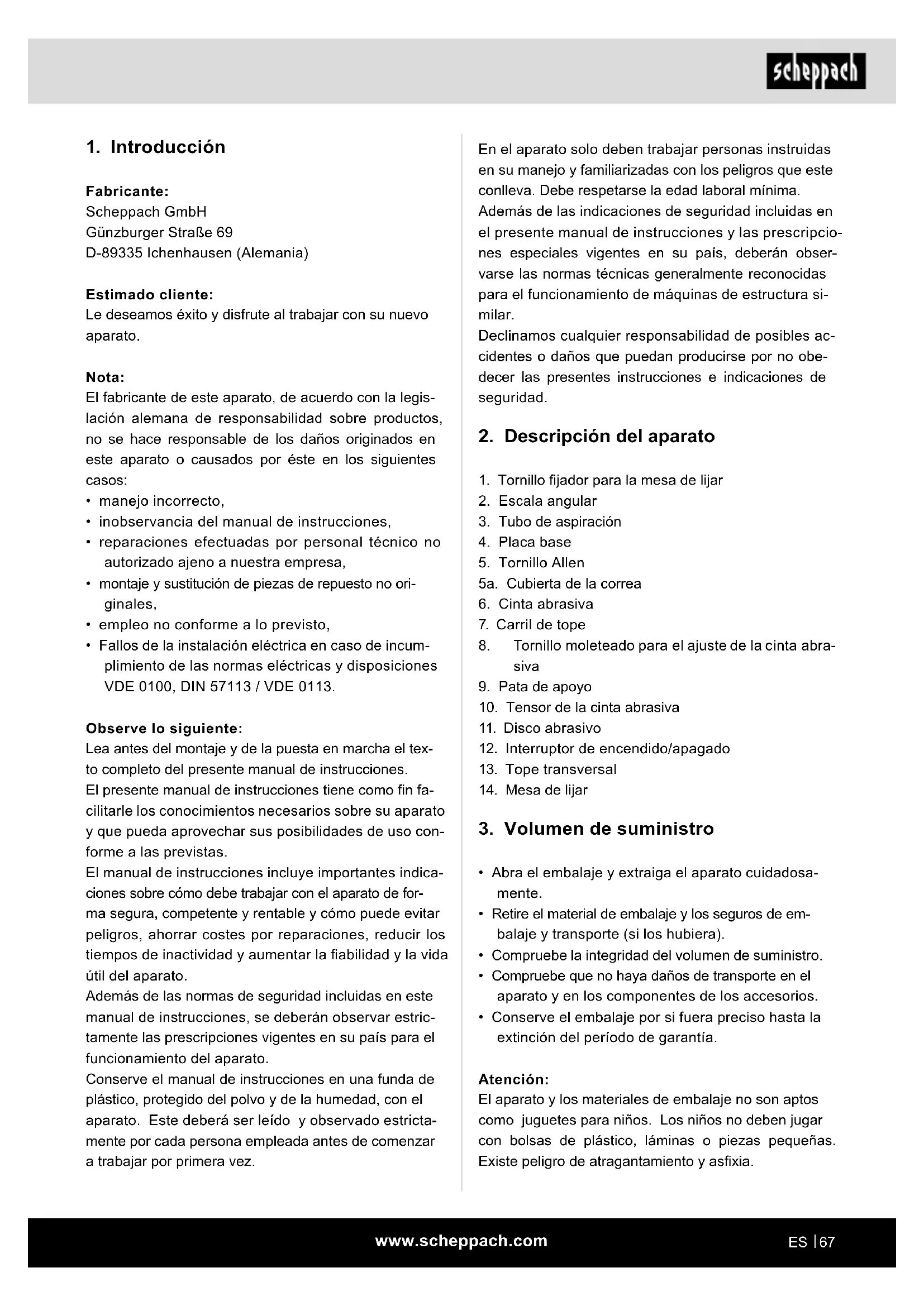 Fabricante: Scheppach GmbH Günzburger Straße 69 D-89335 Ichenhausen (Alemania) Estimado cliente: Le deseamos éxito y disfrute al trabajar con su nuevo aparato. Nota: El fabricante de este aparato, de acuerdo con la legis- lación alemana de responsabilidad sobre productos, no se hace responsable de los daños originados en este aparato o causados por éste en los siguientes casos: