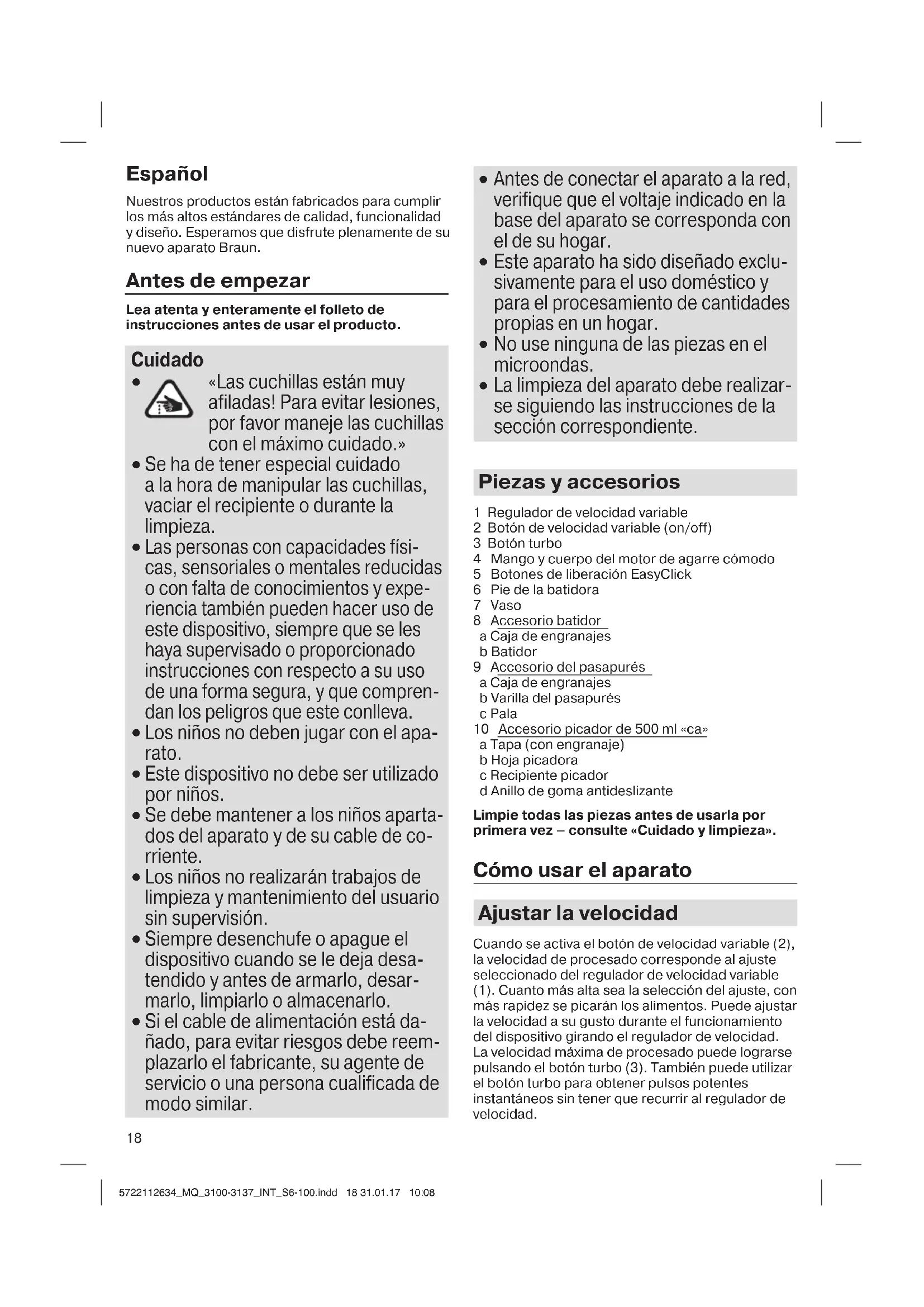 La limpieza del aparato debe realizar- se siguiendo las instrucciones de la sección correspondiente. Piezas y accesorios 1 Regulador de velocidad variable 2 Botón de velocidad variable (on/off) 3 Botón turbo 4 Mango y cuerpo del motor de agarre cómodo 5 Botones de liberación EasyClick 6 Pie de la batidora 7 Vaso 8 Accesorio batidor a Caja de engranajes b Batidor 9 Accesorio del pasapurés a Caja de engranajes b Varilla del pasapurés c Pala 10 Accesorio picador de 500 ml «ca» a Tapa (con engranaje) b Hoja picadora c Recipiente picador d Anillo de goma antideslizante Limpie todas las piezas antes de usarla por primera vez – consulte «Cuidado y limpieza». Cómo usar el aparato Ajustar la velocidad Cuando se activa el botón de velocidad variable (2), la velocidad de procesado corresponde al ajuste seleccionado del regulador de velocidad variable (1). Cuanto más alta sea la selección del ajuste, con más rapidez se picarán los alimentos. Puede ajustar la velocidad a su gusto durante el funcionamiento del dispositivo girando el regulador de velocidad. La velocidad máxima de procesado puede lograrse pulsando el botón turbo (3). También puede utilizar el botón turbo para obtener pulsos potentes instantáneos sin tener que recurrir al regulador de velocidad. 5722112634_MQ_3100-3137_INT_S6-100.indd 18 31.01.17 10:0819 Brazo de batir (A) La batidora de mano es perfecta para preparar cremas, salsas, aliños para ensaladas, sopas, comida infantil, bebidas, smoothies y batidos. Utilice la velocidad turbo para obtener un resultado óptimo. Ensamblado y funcionamiento