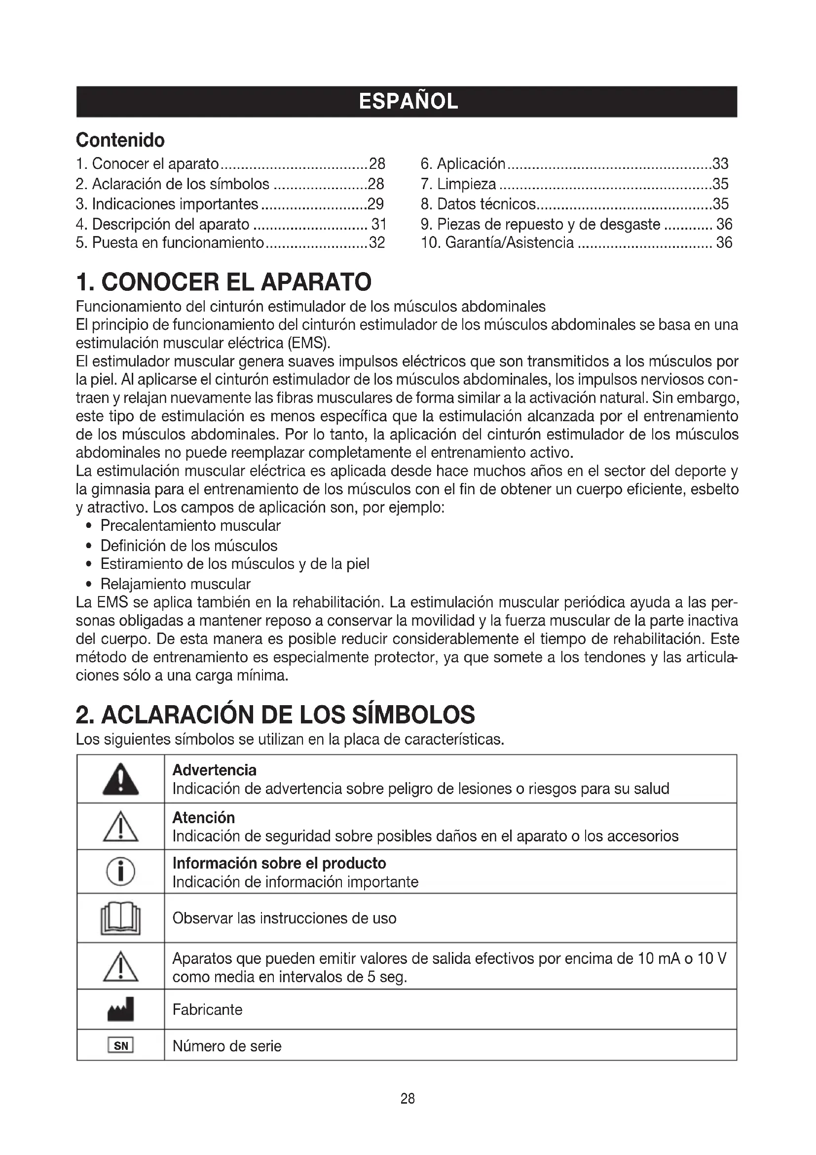 1. Conocer el aparato .................................... 28