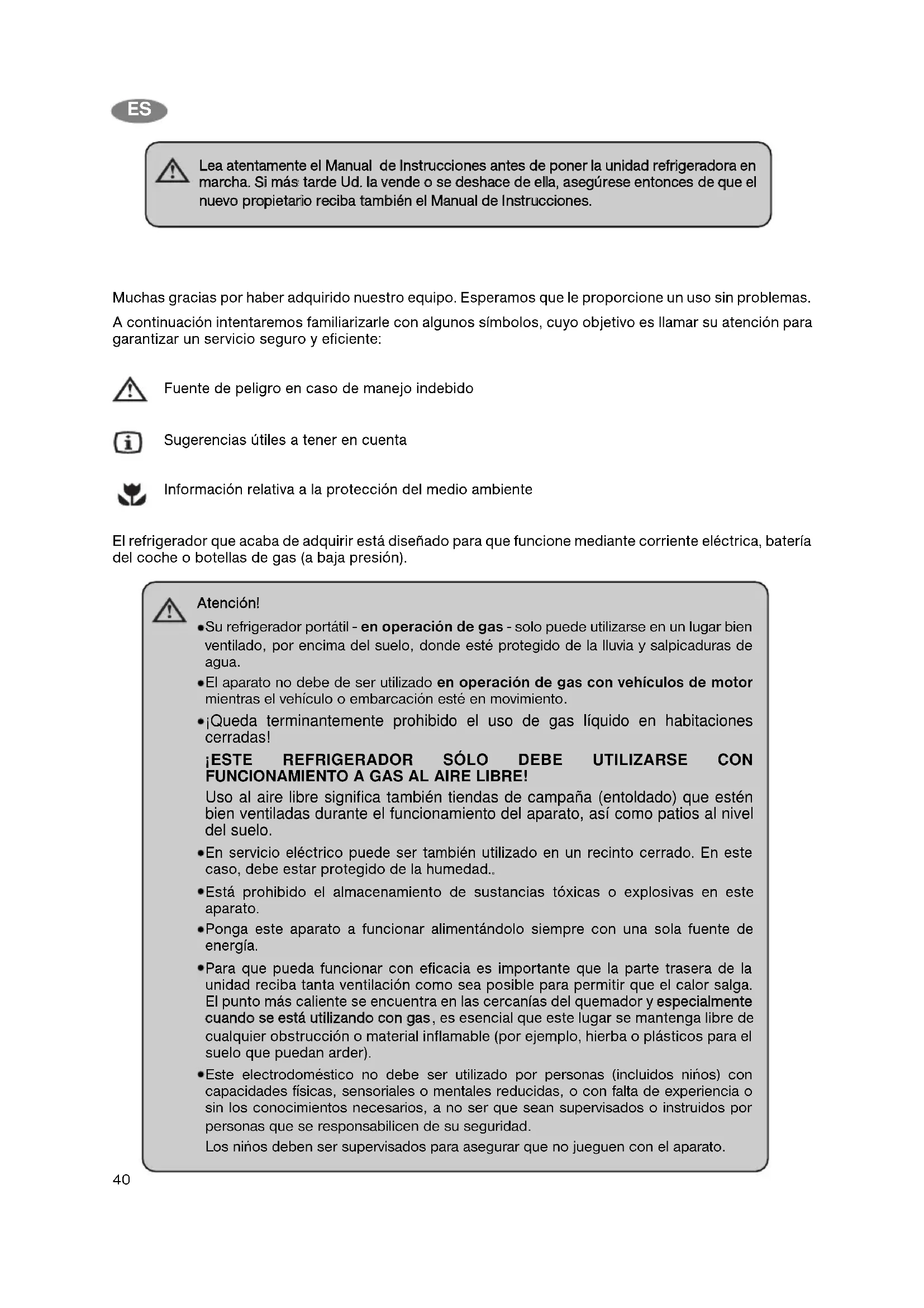 Muchas gracias por haber adquirido nuestro equipo. Esperamos que le proporcione un uso sin problemas. A continuación intentaremos familiarizarle con algunos símbolos, cuyo objetivo es llamar su atención para garantizar un servicio seguro y eficiente: Fuente de peligro en caso de manejo indebido Sugerencias útiles a tener en cuenta Información relativa a la protección del medio ambiente El refrigerador que acaba de adquirir está diseñado para que funcione mediante corriente eléctrica, batería del coche o botellas de gas (a baja presión). LLeeaa aatteennttaammeennttee eell MMaannuuaall ddee IInnssttrruucccciioonneess aanntteess ddee ppoonneerr llaa uunniiddaadd rreeffrriiggeerraaddoorraa eenn mmaarrcchhaa.. SSii mmáás s ttaarrddee UUdd.. llaa vveennddee oo ssee ddeesshhaaccee ddee eellllaa,, aasseeggúúrreessee eennttoonncceess ddee qquuee eell nnuueevvoo pprrooppiieettaarriioo rreecciibbaa ttaammb biiéénn eell MMaannuuaall ddee IInnssttrruucccciioonneess.. AAtteenncciióónn!! Su refrigerador portátil - en operación de gas - solo puede utilizarse en un lugar bien ventilado, por encima del suelo, donde esté protegido de la lluvia y salpicaduras de agua. El aparato no debe de ser utilizado en operación de gas con vehículos de motor mientras el vehículo o embarcación esté en movimiento. ¡Queda terminantemente prohibido el uso de gas líquido en habitaciones cerradas! ¡ESTE REFRIGERADOR SÓLO DEBE UTILIZARSE CON FUNCIONAMIENTO A GAS AL AIRE LIBRE! Uso al aire libre significa también tiendas de campaña (entoldado) que estén bien ventiladas durante el funcionamiento del aparato, así como patios al nivel del suelo. En servicio eléctrico puede ser también utilizado en un recinto cerrado. En este caso, debe estar protegido de la humedad