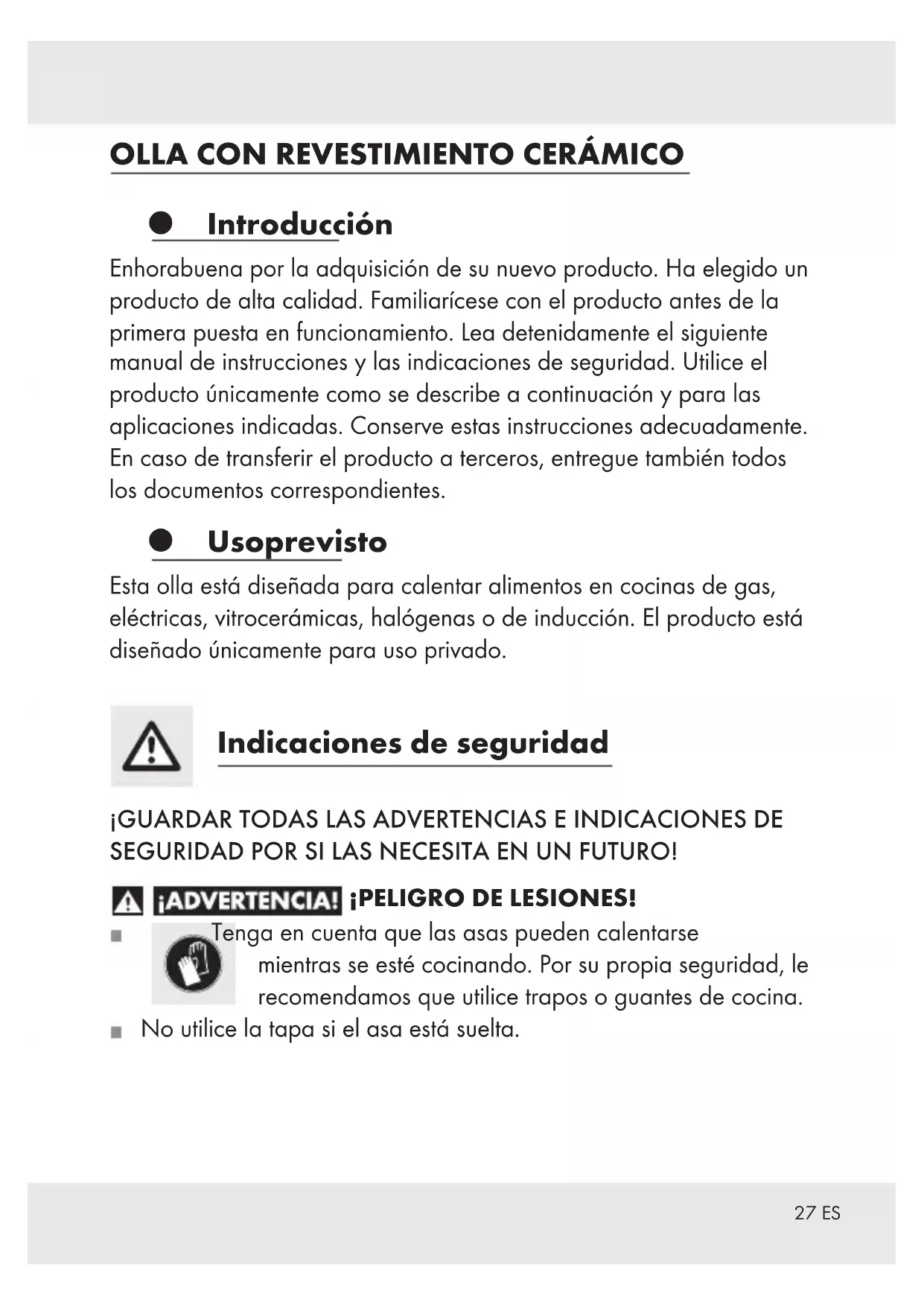 Introducción Enhorabuena por la adquisición de su nuevo producto. Ha elegido un producto de alta calidad. Familiarícese con el producto antes de la primera puesta en funcionamiento. Lea detenidamente el siguiente manual de instrucciones y las indicaciones de seguridad. Utilice el producto únicamente como se describe a continuación y para las aplicaciones indicadas. Conserve estas instrucciones adecuadamente. En caso de transferir el producto a terceros, entregue también todos los documentos correspondientes. Uso previsto Esta olla está diseñada para calentar alimentos en cocinas de gas, eléctricas, vitrocerámicas, halógenas o de inducción. El producto está diseñado únicamente para uso privado. Indicaciones de seguridad ¡GUARDAR TODAS LAS ADVERTENCIAS E INDICACIONES DE SEGURIDAD POR SI LAS NECESITA EN UN FUTURO! ¡PELIGRO DE LESIONES! Tenga en cuenta que las asas pueden calentarse mientras se esté cocinando. Por su propia seguridad, le recomendamos que utilice trapos o guantes de cocina. No utilice la tapa si el asa está suelta.28 ES ¡PELIGRO DE DAÑOS MATERIALES! Al cocinar, es importante que no deje desatendidas ollas y sartenes en las que se esté calentando grasa. La grasa puede sobrecalentarse rápidamente e inflamarse. Atención: en caso de que la grasa se inflamara, nunca intente apagar el fuego con agua. Extinga las llamas con una tapadera o con un tejido grueso de lana. Para no dañar la capa antiadherente, utilice exclusivamente utensilios de cocina resistentes al calor o de madera. No corte los alimentos directamente dentro de la olla. No deposite carne húmeda sobre la grasa caliente. La grasa que salpique sobre una placa de cocina encendida puede provocar fácilmente un incendio. Las altas temperaturas pueden decolorar el exterior del producto. Esto no indica una falla en el material, ni tampoco afecta la calidad o capacidad del producto se desempeñar su función. Elija la placa de cocina que mejor se adecue al diámetro de la olla para evitar pérdidas de calor. El artículo está indicado para mantener el calor de los alimentos en el horno (máx. 150 °C durante 1 hora). No sostenga el producto caliente bajo el agua fría. La parte inferior del producto podría dañarse o desprenderse del producto. El producto es apto para su uso en lavavajillas. Una limpieza frecuente del producto con limpiadores fuertes puede dañarlo y decolorarlo. Lavar la sartén en el lavavajillas puede provocar una decoloración de las piezas de aluminio. ¡ATENCIÓN! La tapa de cristal puede romperse / no es resistente a golpes.29 ES Para la limpieza a mano, lave la olla con agua caliente y con detergente de uso corriente. Al hacerlo, evite el uso de objetos punzantes para no dañar el material. ¡PRECAUCIÓN! ¡ARAÑAZO! ¡Eviterozaduras de las ollas de cocción sobre vitro-cerámicas! Antes de empezar a cocinar, le recomendamos que limpie la superficie de la encimera y el fondo del recipiente con un paño limpio y sin pelusas (por ejemplo con micro-fibra). Así puede evitar rasguños. Tenga en cuenta que debido al color claro del producto, pueden aparecer ligeras decoloraciones durante su utilización. Estas decoloraciones son consecuencia del uso normal del producto y no suponen una pérdida de la calidad de la cubierta ni de su utilidad. P Nota para quemadores eléctricos J Nota: en determinadas condiciones puede oirse un ruido resultado de las propiedades electromagnéticas de la fuente de calor y de la cacerola / sartén. J Esto es totalmente normal y no implica que su quemador eléctrico o sus utensilios de cocina estén dañados. J Coloque la cacerola / sartén en mitad de la placa de inducción. J ¡PRECAUCIÓN! La velocidad de calentamiento es muy rápida. No sobrecaliente los utensilios de cocina cuando esté precalentándolos.30 ES J La habitación debe estar bien ventilada por si los utensilios de cocina se sobrecalientan. J Este artículo combina las ventajas de los utensilios de cocina de aluminio, tales como su bajo peso y alta conductividad térmica, con las ventajas de cocinar por inducción. Para posibilitar esto, elementos de acero magnéticos fueron insertados en la base de aluminio. Por ello el fondo no es siempre magnético, y puede no responder en aquellas placas de inducción, que significativamente excedan el diámetro de la base. Esto no es un defecto de calidad y no interfiere en el funcionamiento. Para que el artículofuncione correctamente, ajústelo siempre en la base para hacerlo coincidir con el diámetro de cocción de la placa. Uso J Antes de usar por primera vez el producto, asegúrese de extraer posibles etiquetas y enjuáguelo con agua caliente. J Hierva la olla antes del primer uso 2 – 3 veces con agua para eliminar completamente los posibles residuos de producción. J No sobrecaliente la olla ya esté vacía o llena para evitar que el efecto antiadherente disminuya al dañarse el revestimiento.31 ES Eliminación El embalaje se compone de materiales que respetan el medio ambiente que podrá desechar en los puntos locales de reciclaje. Puede averiguar las opciones para eliminar el producto fuera de uso en la administración de su municipio o ciudad. Garantía El producto ha sido fabricado cuidadosamente siguiendo exigentes normas de calidad y ha sido probado antes de su entrega. En caso de defecto del producto, usted tiene derechos legales frente al vendedor del mismo. Nuestra garantía (abajo indicada) no supone una restricción de dichos derechos legales. Este producto dispone de una garantía de 3 años desde la fecha de compra. El plazo de garantía comienza a partir de la fecha de compra. Por favor, conserve adecuadamente el justificante de compra original. Este documento se requerirá como prueba de que se realizó la compra. Si en el plazo de 3 años a partir de la fecha de compra se produce un fallo de material o fabricación en este producto, repararemos el producto o lo sustituiremos gratuitamente por un producto nuevo (según nue