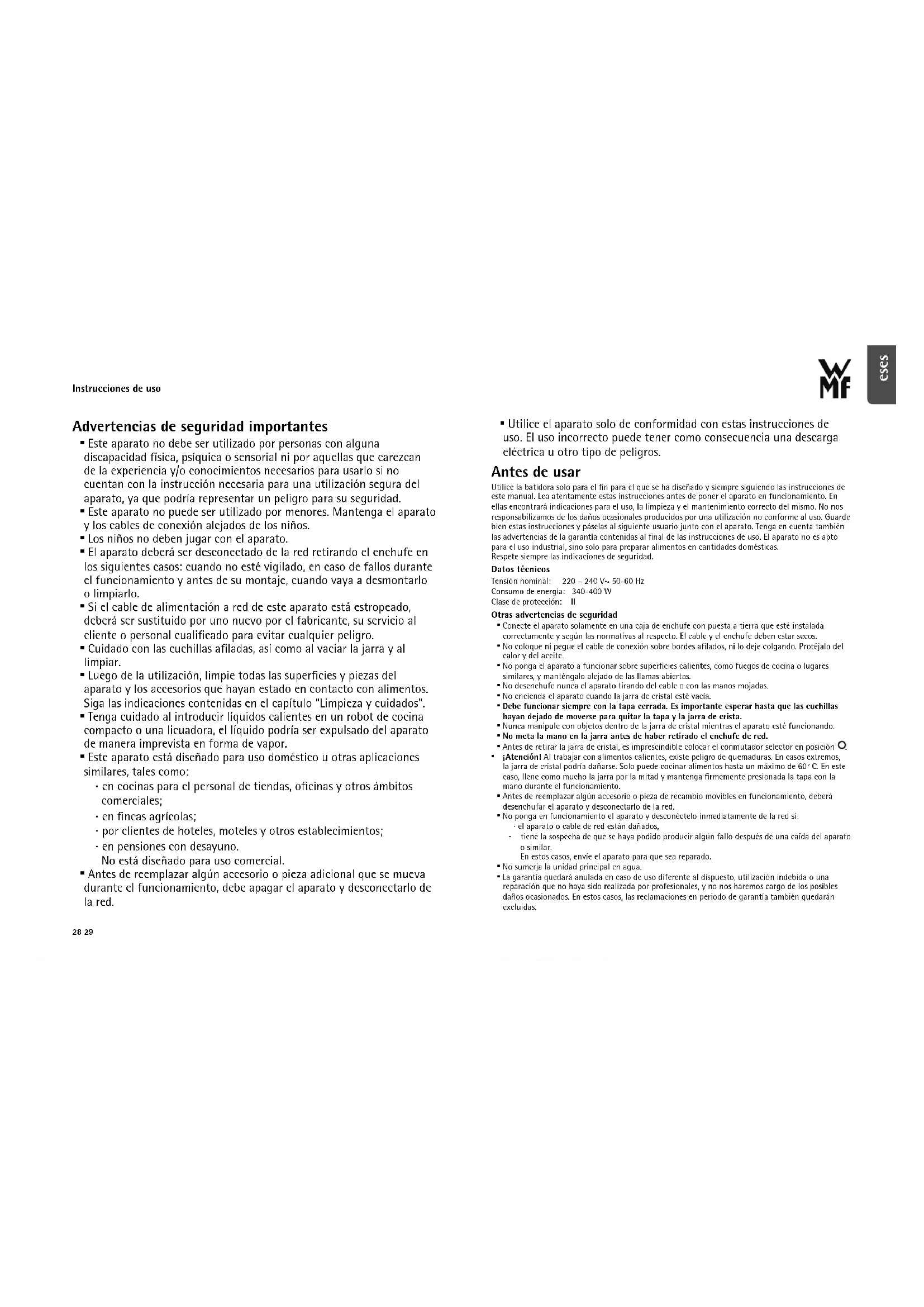 Utilización La batidora de pie WMF KITCHENminis® es un aparato de cocina que ahorra espacio y energía. Con este aparato puede preparar zumos, licuados, sopas, etc. Gracias a su diseño compacto y la fuerza del motor podrá procesar también pequeñas cantidades. La utilización del aparato es sumamente confortable, pues su manipulación es sencilla e intuitiva y está fabricado con materiales de alta calidad. Puesta en marcha