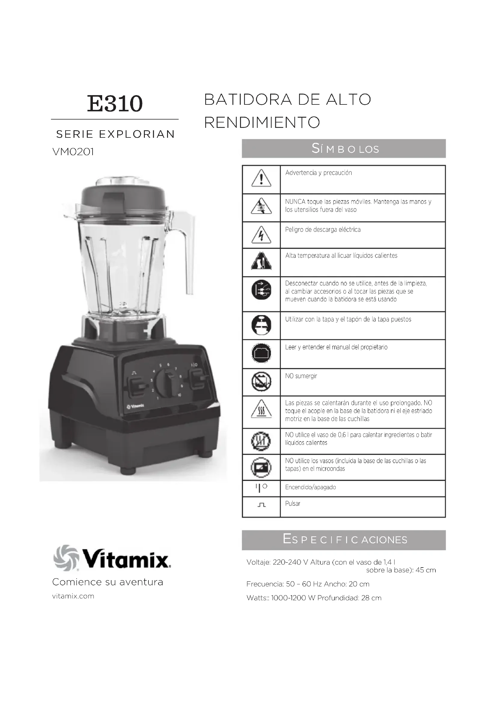 Encuentra gratis el manual del aparato Explorian E310 Vitamix en formato PDF.