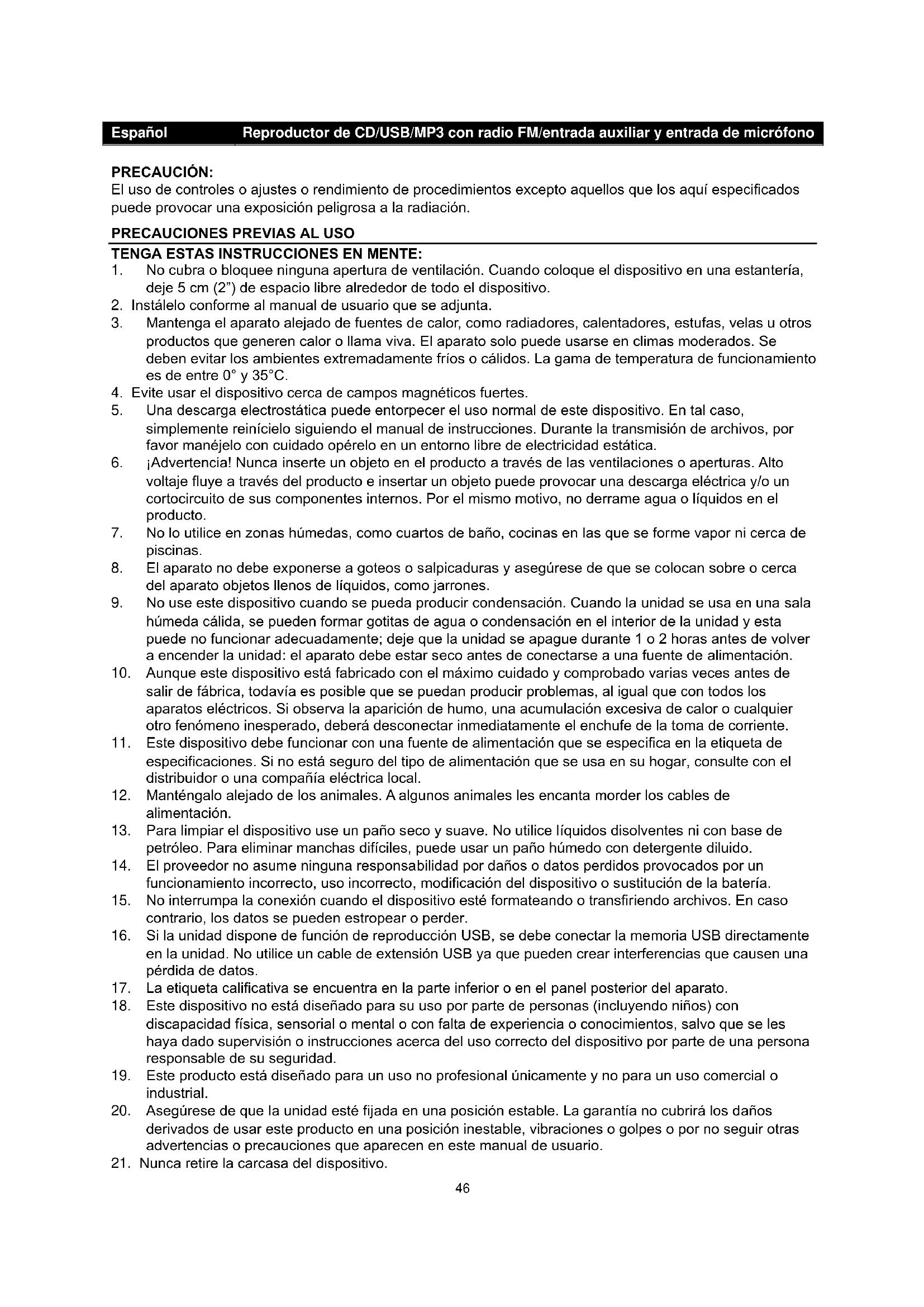 Precaución: El uso de los controles o ajustes o el funcionamiento de los procedimientos excepto a aquellos especificados aquí pueden provocar una exposición peligrosa a la radiación. Esta unidad no debe ajustarse o repararse por ninguna persona salvo personal de servicio cualificado. Importante: Como el movimiento del mecanismo del CD y los circuitos sensible pueden causar interferencias a la radio cercana, apague esta unidad mientras opera otros dispositivos de radio.51 Debido a la complejidad del control MCU, por favor, desconecte la alimentación de la unidad si la unidad deja de funcionar durante la operación. ¡Esto no constituye un mal funcionamiento del sistema!