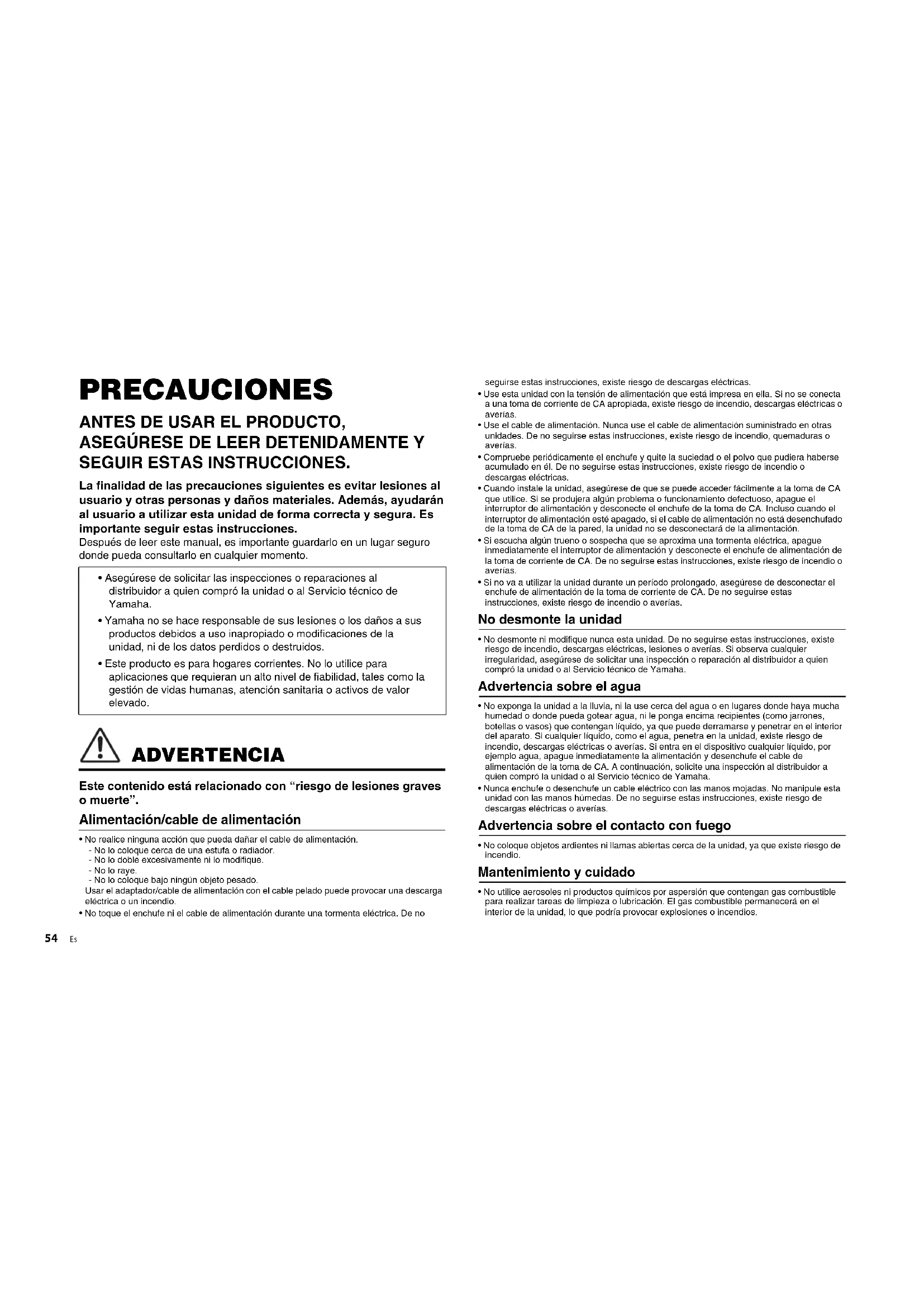 - No desmonte ni modifique nunca esta unidad. De no seguirse estas instrucciones, existe riesgo de incendio, descargas eléctricas, lesiones o averías. Si observa cualquier irregularidad, asegúrese de solicitar una inspección o reparación al distribuidor a quien compró la unidad o al Servicio técnico de Yamaha. Advertencia sobre el agua