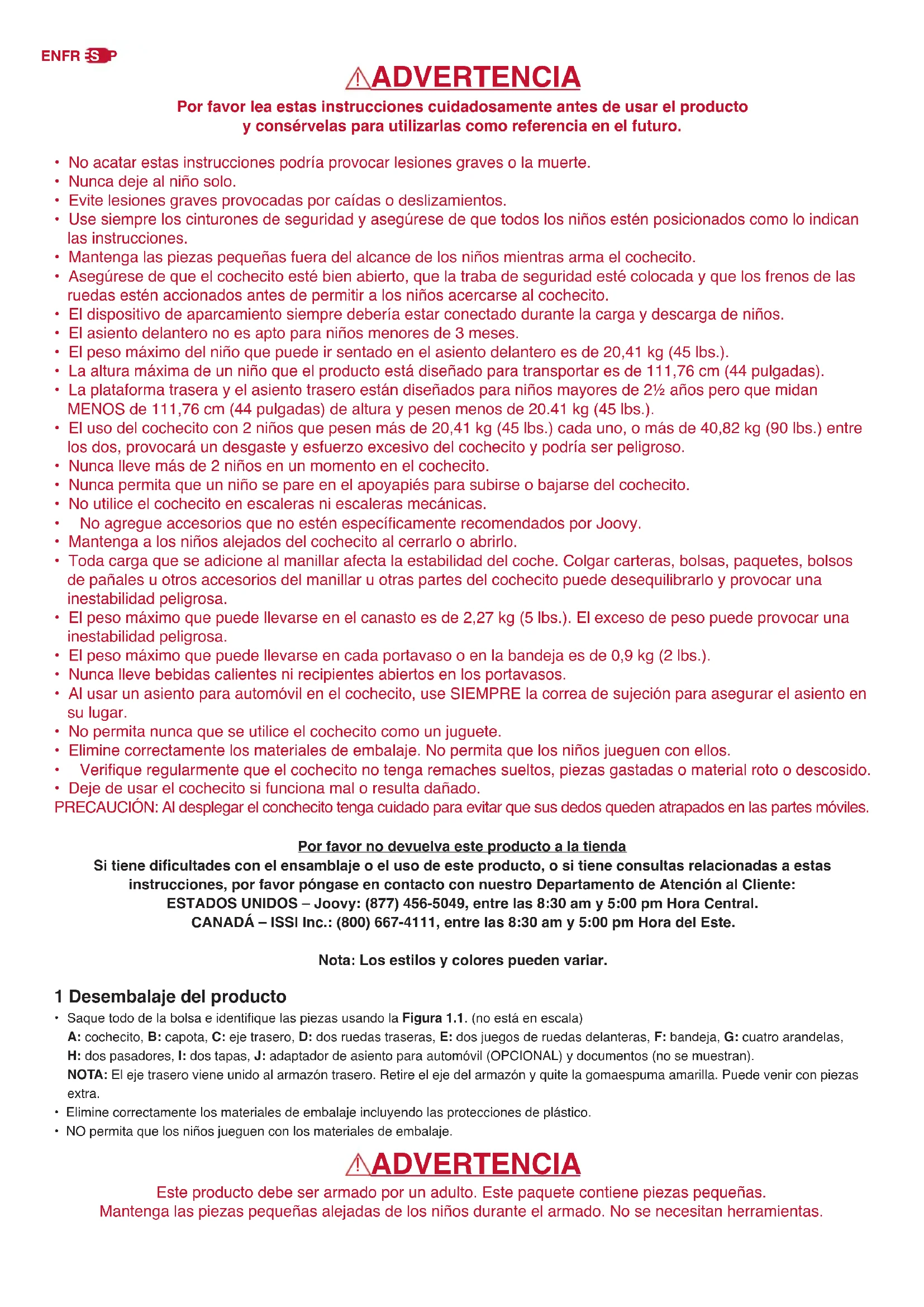 - Deje de usar el cochecito si funciona mal o resulta dañado. PRECAUCIÓN: Al desplegar el conchecito tenga cuidado para evitar que sus dedos queden atrapados en las partes móviles. Por favor no devuelva este producto a la tienda Si tiene dicultades con el ensamblaje o el uso de este producto, o si tiene consultas relacionadas a estas instrucciones, por favor póngase en contacto con nuestro Departamento de Atención al Cliente: ESTADOS UNIDOS – Joovy: (877) 456-5049, entre las 8:30 am y 5:00 pm Hora Central. CANADÁ – ISSI Inc.: (800) 667-4111, entre las 8:30 am y 5:00 pm Hora del Este. Nota: Los estilos y colores pueden variar. 1 Desembalaje del producto
