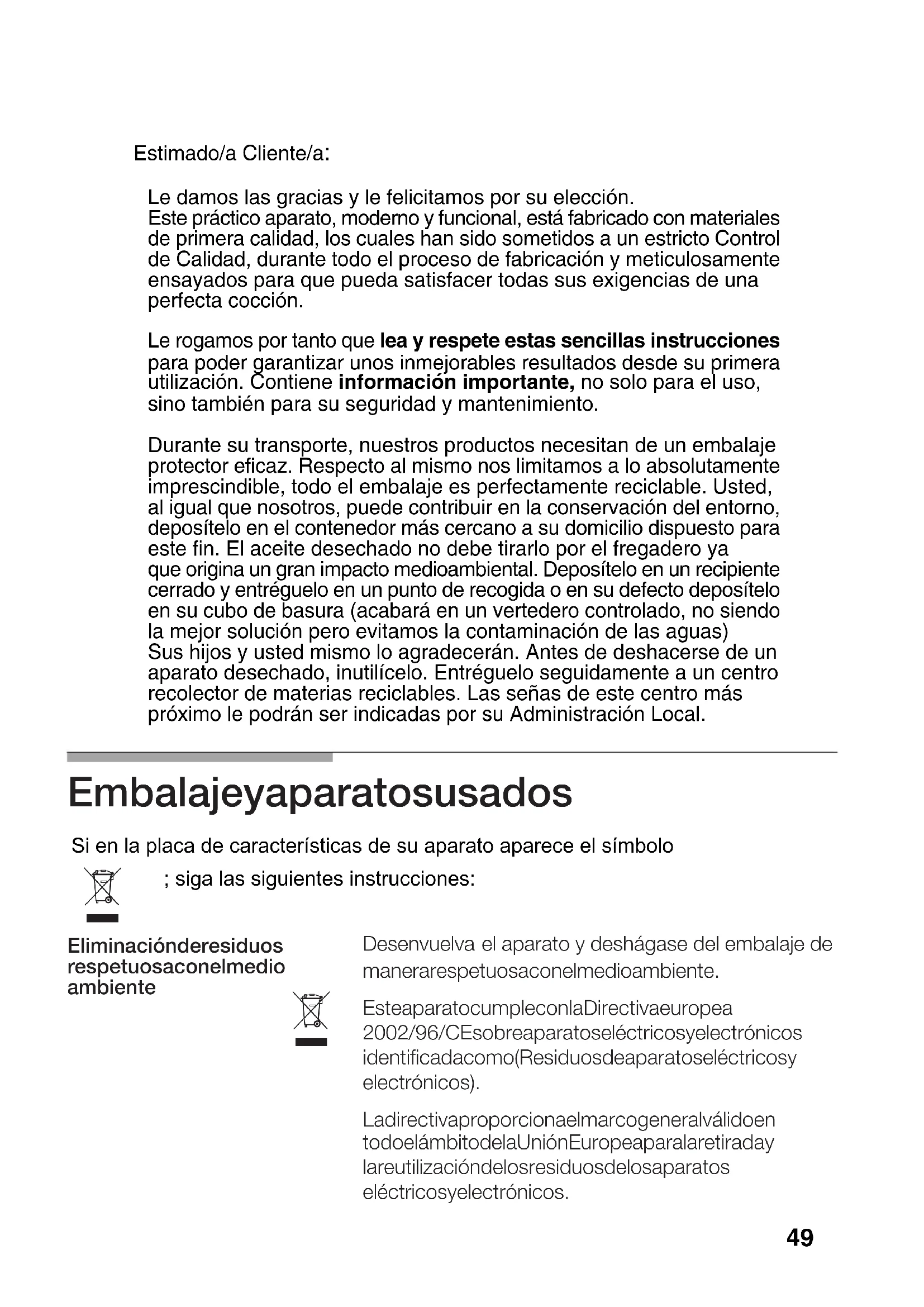 - Fusibile difettoso. candelo.Condizioni di garanzia Le condizioni di garanzia applicabili a questo apparecchio sono quelle stabilite dalla rappresentanza della nostra azienda nel paese in cui è stato compiuto l'acquisto. Se lo desiderate, il venditore che vi ha venduto l'apparecchio sarà sempre a vostra disposizione per fornirVi tutti i dettagli necessari in merito. Per potersi avvalere della garanzia sarà comunque necessario presentare la ricevuta d'acquisto. L'azienda si riserva il diritto di apportare modifiche. In caso di chiamata al nostro Ufficio Tecnico, si prega di indicare: E - NR FD Queste indicazioni sono riportate sulla targa d'identificazione dell'apparecchio situata nella parte inferiore del piano di cottura. 48Estimado/a Cliente/a: Le damos las gracias y le felicitamos por su elección. Este práctico aparato, moderno y funcional, está fabricado con materiales de primera calidad, los cuales han sido sometidos a un estricto Control de Calidad, durante todo el proceso de fabricación y meticulosamente ensayados para que pueda satisfacer todas sus exigencias de una Le rogamos por tanto que lea y respete estas sencillas instrucciones para poder garantizar unos inmejorables resultados desde su primera utilización. Contiene información importante, no solo para el uso, sino también para su seguridad y mantenimiento. Durante su transporte, nuestros productos necesitan de un embalaje protector eficaz. Respecto al mismo nos limitamos a lo absolutamente imprescindible, todo el embalaje es perfectamente reciclable. Usted, al igual que nosotros, puede contribuir en la conservación del entorno, deposítelo en el contenedor más cercano a su domicilio dispuesto para este fin. El aceite desechado no debe tirarlo por el fregadero ya que origina un gran impacto medioambiental. Deposítelo en un recipiente cerrado y entréguelo en un punto de recogida o en su defecto deposítelo en su cubo de basura (acabará en un vertedero controlado, no siendo la mejor solución pero evitamos la contaminación de las aguas) Sus hijos y usted mismo lo agradecerán. Antes de deshacerse de un aparato desechado, inutilícelo. Entréguelo seguidamente a un centro recolector de materias reciclables. Las señas de este centro más próximo le podrán ser indicadas por su Administración Local.