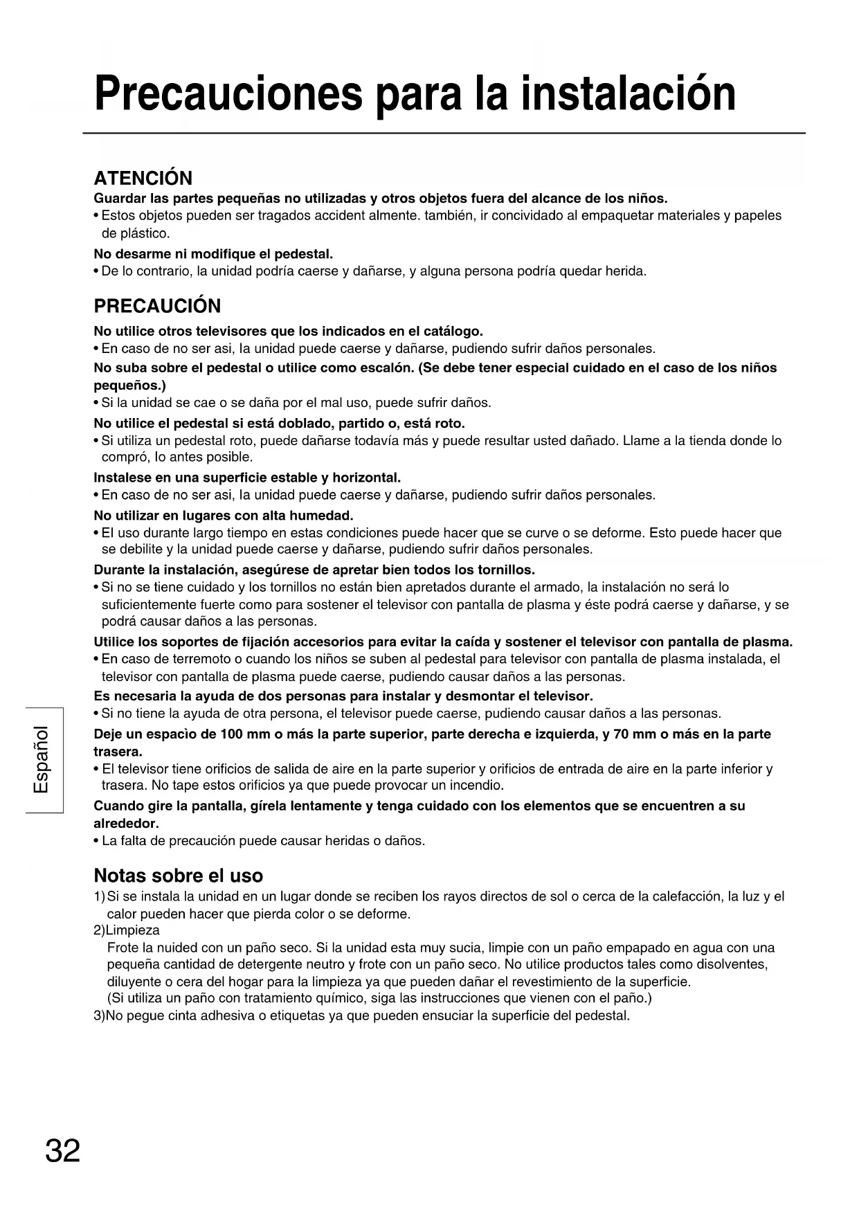 - En caso de terremoto o cuando los niños se suben al pedestal para televisor con pantalla de plasma instalada, el televisor con pantalla de plasma puede caerse, pudiendo causar daños a las personas. Es necesaria la ayuda de dos personas para instalar y desmontar el televisor.