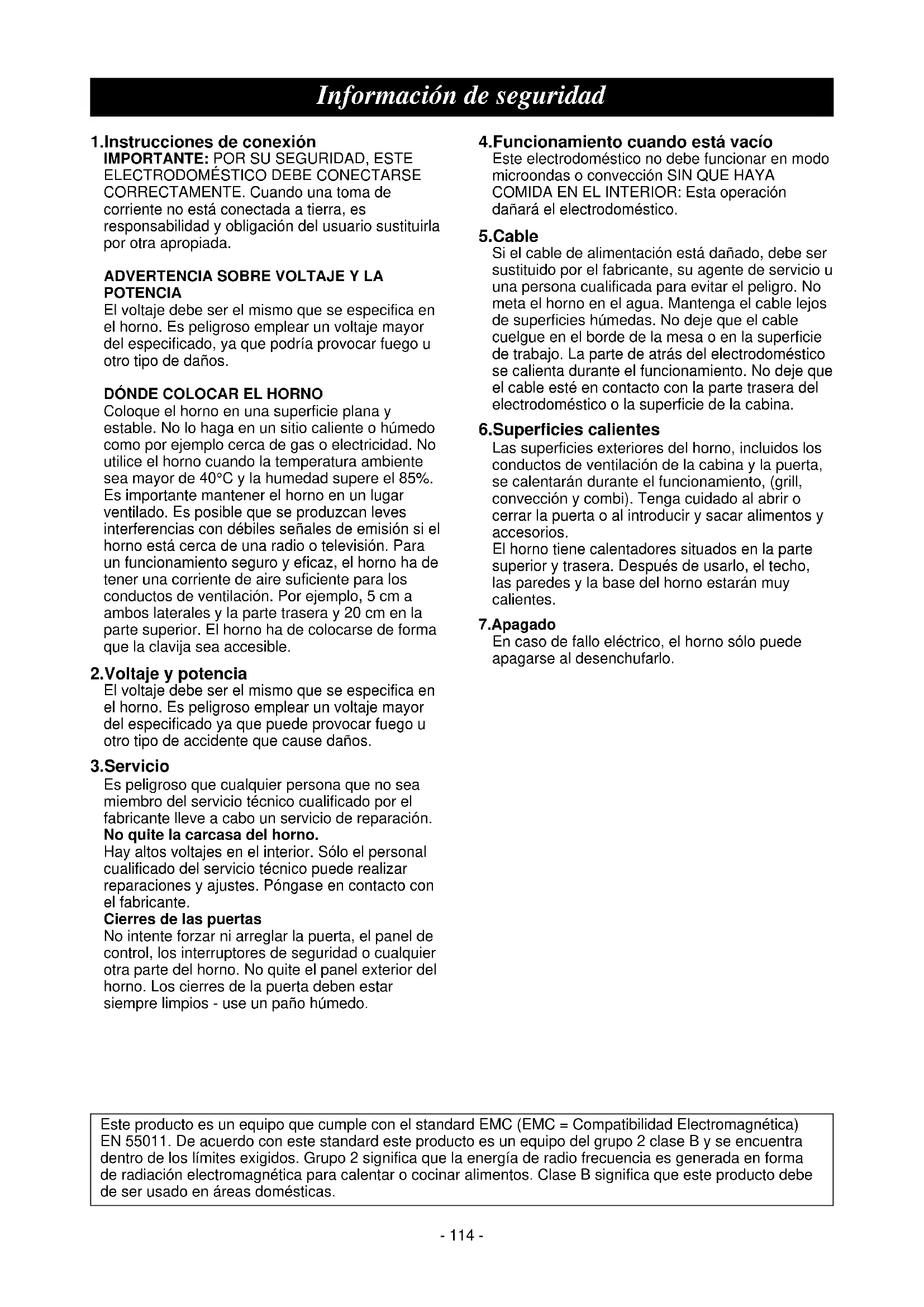 VENTILACIÓN. 2.Temperatura ambiente máxima No utilice el horno cuando la temperatura ambiente sea mayor de 40°C y la humedad supere el 90%. Es importante la corriente de aire alrededor del horno. 3.Uso en exteriores No lo use en exteriores. 4.Almacenamiento de accesorios Cuando no use el horno, no almacene en su interior otros objetos que no sean los accesorios del horno por si se conectase de forma accidental. En caso de fallo eléctrico, el horno sólo puede apagarse en la toma de salida. Funcionamiento 1.Examine el horno Desembale el horno, conserve este material, y examínelo por si hubiera algún daño como abolladuras, cierres rotos o grietas en la puerta. Póngase en contacto con su proveedor en caso de que el aparato esté defectuoso. Nota: no instale el aparato si está defectuoso. 2.Cierres de las puertas Deben de inspeccionarse los cerrojos de la puerta y sus áreas para ver si están dañadas. El electrodoméstico no debe utilizarse hasta que haya sido reparado por un técnico del servicio formado por el fabricante. 3.Tarjeta de garantía Rellene y envíe la siguiente tarjeta de garantía en la que ya aparece la dirección. 4.Quitar la película de protección La película de protección se usa para evitar que la carcasa sufra arañazos durante el transporte. Despegue esta película antes de la instalar o usar el horno. 1.Dónde colocar el horno El horno debe colocarse en una superficie plana y estable. Para un correcto funcionamiento, el horno debe tener suficiente corriente de aire. Debe existir un espacio de al menos 5 cm en los laterales y la parte trasera del horno. Debe dejarse un espacio mínimo de 20 cm en la parte superior y en los dos conductos de extracción de la parte posterior. 2.Estanterías No coloque el horno en una estantería cerca de un quemador de gas o eléctrico, cocina o freidora. El horno puede dañarse. Es peligroso colocar el horno en una estantería demasiado alta en la que el usuario no pueda sacar los alimentos y accesorios de forma segura. 3.Apilar NO trate de apilar estos hornos. 1.Antes de usarlo Antes de usar los modos convección, combi y grill retire todos los accesorios del horno. 2.Humo/fuego En caso de que vea humo mientras cocina en modo microondas, mantenga cerrada la puerta del horno y desconéctelo. En caso de los materiales que haya dentro del horno prendan, mantenga cerrada la puerta y presione STOP/RESET [Detener/Reestablecer]. Desconéctelo. Si es posible, corte la energía en el panel del circuito. 3.Interferencias Es posible que se produzcan leves interferencias con débiles señales de emisión si es horno está cerca de una radio o televisión. 4.Funcionamiento caliente Al usar las potencias Alto, Mediano, Bajo y Fuego lento los elementos del grill y el ventilador del modo convección funcionan para reducir la condensación. NO TOQUE LA PARTE SUPERIOR. 5.Limpieza No limpie este electrodoméstico con un chorro de agua. El no mantener el horno limpio puede provocar el deterioro de su interior y podría afectar de forma negativa a la vida del electrodoméstico e incluso provocar una situación peligrosa. Precaución- 116 - Información importante – Léala detenidamente 1.Tiempos de cocción Los tiempos de cocción del modo microondas y combi son mucho más cortos que los de otros métodos, por eso es importante que los tiempos de cocción recomendados no se excedan sin haber comprobado primero los alimentos. Los tiempos para cocinar que se proporcionan son aproximados. Los factores que pueden afectar al proceso son: temperatura de inicio, volumen, tamaño y forma de los alimentos y platos que se usan. 2.Pequeñas cantidades de comida Las pequeñas cantidades de alimentos con un poco de humedad pueden prender o secarse si se cocinan demasiado. 3.Componentes de la comida La comida rica en azúcares, sal, grasas y humedad se calienta más rápido en modo microondas ya que sus propiedades atraen su energía. Aquellas ricas en proteínas y fibra absorben la energía del microondas más despacio, lo que implica un mayor tiempo de cocción. 4.Comida rica en grasas/azúcares Es importante establecer de forma correcta el tiempo para las comidas ricas en grasas, alcohol y azúcares. Si se calientan demasiado en el microondas pueden prender. NUNCA LOS PIERDA DE VISTA. Por ejemplo: donuts, postres de sirope, dulces navideños, etc. 5.Huevos No cueza huevos con cáscara en modo MICROONDAS. La presión los puede hacer explotar. 6.Pieles porosas Las patatas, manzanas, yemas de huevos, cualquier vegetal y salchichas son ejemplos de alimentos que no tienen una piel porosa. Por ello deben agujerearse usando un tenedor antes de cocinarlos en el microondas con el fin e prevenir que exploten. 7.Freír No trate de freír en el horno. 8.Comprobar la temperatura interna Para asegurar la completa destrucción de las bacterias de la comida, como la listeria y salmonela, asegúrese de que la temperatura interna de la comida alcanza al menos los 72°C. Utilice un termómetro adecuado para comprobar la temperatura al final del proceso de cocción. Caliente durante más tiempo si no se alcanzan las temperaturas correctas. NO USE un termómetro doméstico, sólo el equipo adecuado. 9.Líquidos Al calentar líquidos en modo microondas, como sopas, salsas, bebidas, pueden llegar a burbujear si se sobrepasa el punto de ebullición. Esto puede resultar en un hervido repentino del líquido caliente. Para evitar esta posibilidad, siga estos pasos: a. Evite usar recipientes de cuello estrecho. b. No lo sobrecaliente. c. Remueva el líquido antes de colocarlo en el horno y repita la operación al llegar a la mitad del tiempo de cocción. d. Una vez calentado, déjelo en el horno unos segundos, remueva de nuevo antes de sacar el recipiente del horno. 10.Papel, plástico Si calienta comida con plástico o papel, compruebe el horno con frecuencia ya que podría prender si se sobrecalienta. (Consulte la página 120.) No use productos de papel reciclado, pueden conte