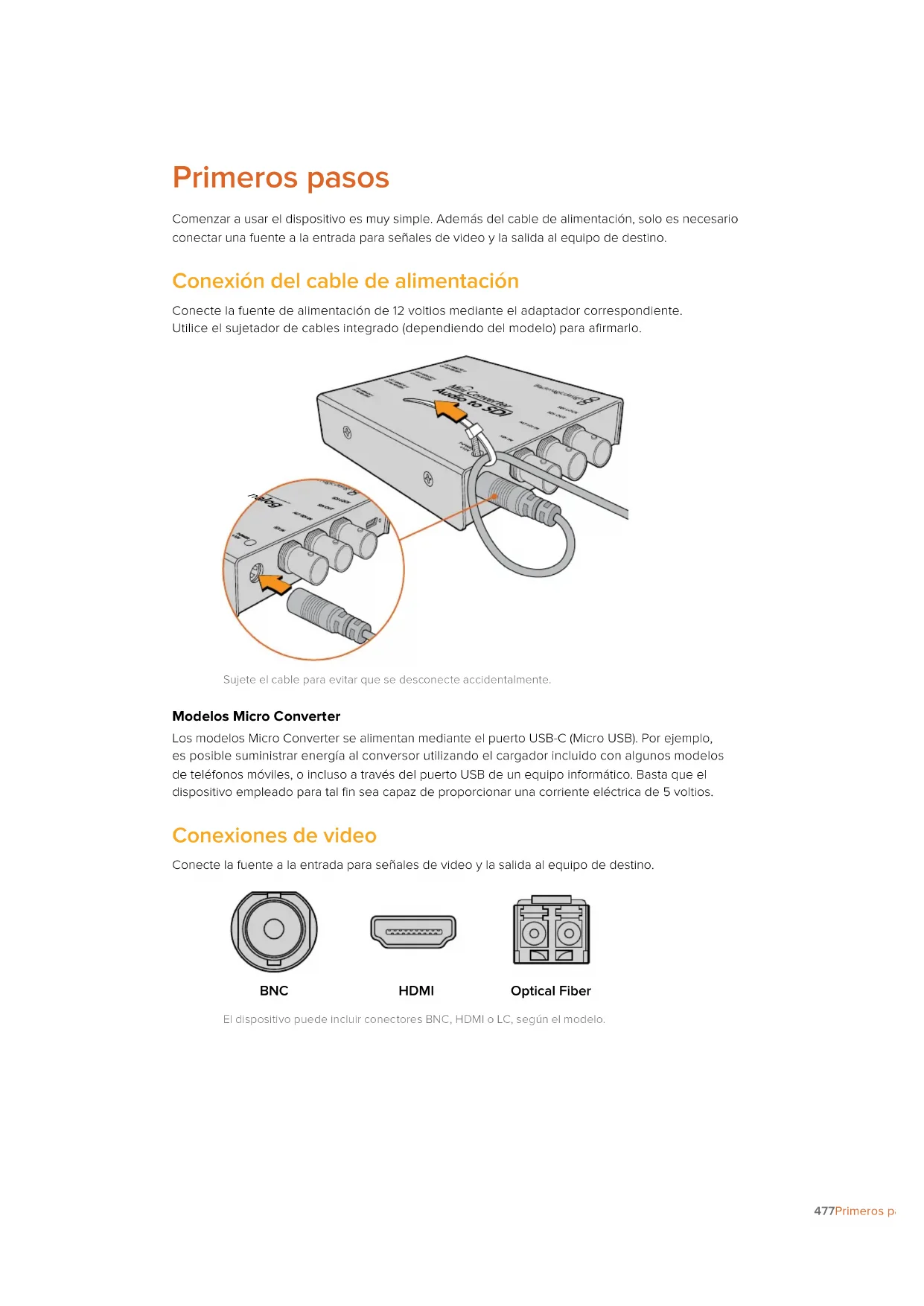 SDI IN POWER +12V SDI to Analog Sujete el cable para evitar que se desconecte accidentalmente. Modelos Micro Converter Los modelos Micro Converter se alimentan mediante el puerto USB-C (Micro USB). Por ejemplo, esposible suministrar energía al conversor utilizando el cargador incluido con algunos modelos deteléfonos móviles, o incluso a través del puerto USB de un equipo informático. Basta que el dispositivo empleado para tal fin sea capaz de proporcionar una corriente eléctrica de 5 voltios. Conexiones de video Conecte la fuente a la entrada para señales de video y la salida al equipo de destino. BNC HDMI Optical Fiber El dispositivo puede incluir conectores BNC, HDMI o LC, según el modelo. 477Primeros pasosConexiones para fibra óptica Algunos de los modelos de conversores de Blackmagic incluyen un compartimento compatible con módulos SFP de fibra óptica para señales SDI 3G, 6G y 12G. Dichos módulos son transmisores y receptores ópticos que cuentan con conexiones para cables de fibra óptica.