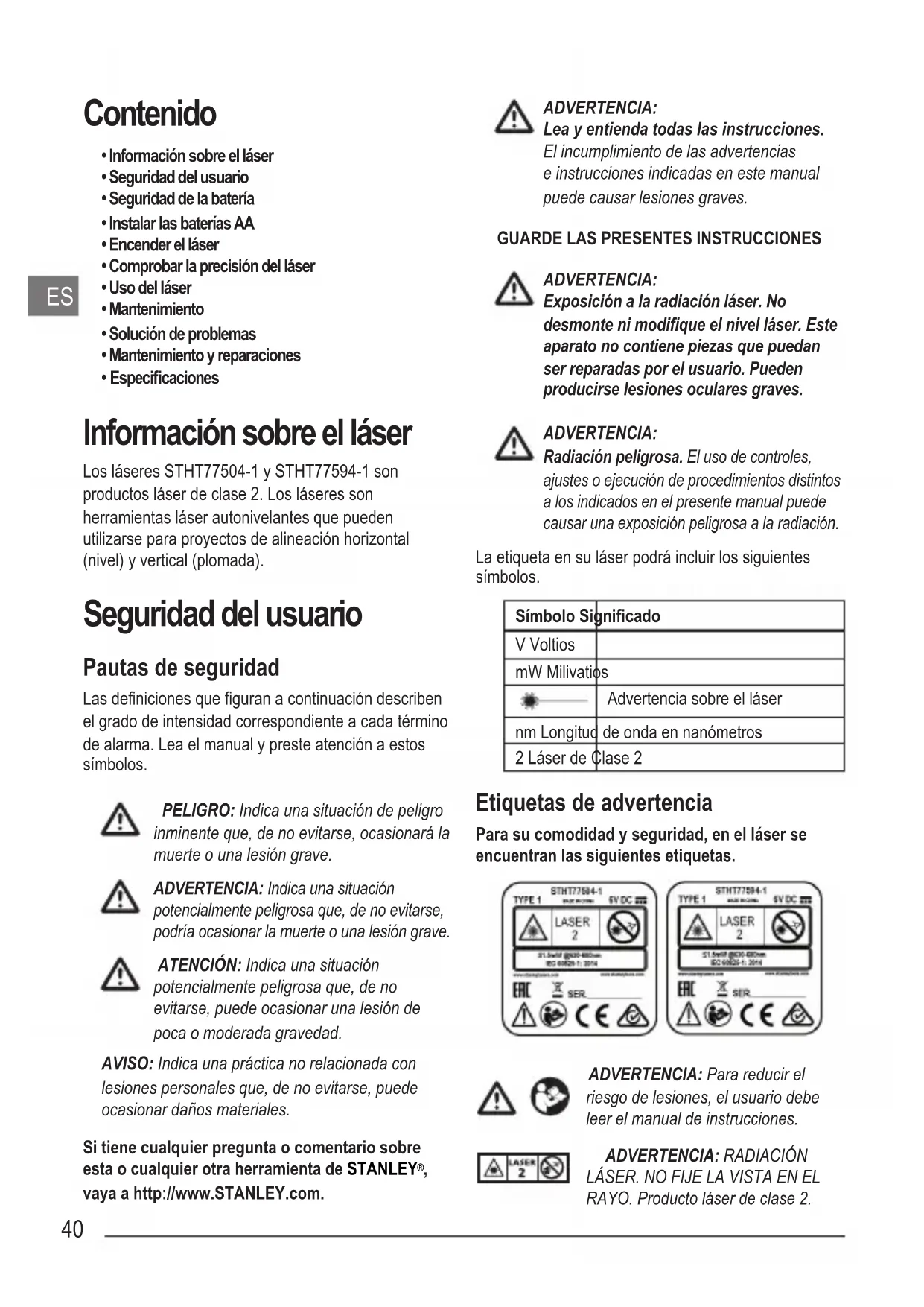 - Especicaciones Información sobre el láser Los láseres STHT77504-1 y STHT77594-1 son productos láser de clase 2. Los láseres son herramientas láser autonivelantes que pueden utilizarse para proyectos de alineación horizontal (nivel) y vertical (plomada). Seguridad del usuario Pautas de seguridad Las deniciones que guran a continuación describen el grado de intensidad correspondiente a cada término de alarma. Lea el manual y preste atención a estos símbolos. PELIGRO: Indica una situación de peligro inminente que, de no evitarse, ocasionará la muerte o una lesión grave. ADVERTENCIA: Indica una situación potencialmente peligrosa que, de no evitarse, podría ocasionar la muerte o una lesión grave. ATENCIÓN: Indica una situación potencialmente peligrosa que, de no evitarse, puede ocasionar una lesión de poca o moderada gravedad. AVISO: Indica una práctica no relacionada con lesiones personales que, de no evitarse, puede ocasionar daños materiales. Si tiene cualquier pregunta o comentario sobre esta o cualquier otra herramienta de STANLEY