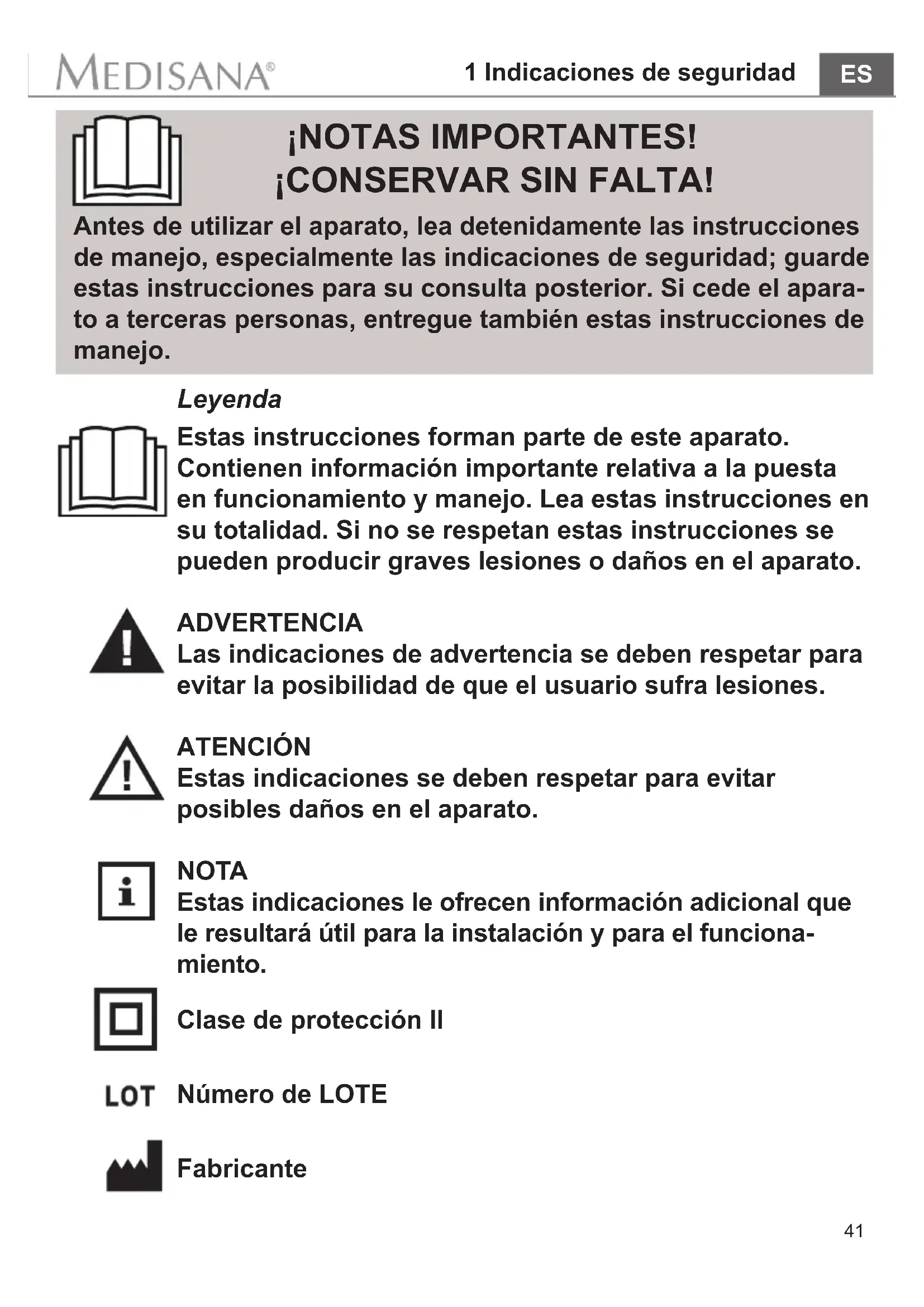 Clase de protección II Número de LOTE Fabricante 1 Indicaciones de seguridad ¡NOTAS IMPORTANTES! ¡CONSERVAR SIN FALTA! Antes de utilizar el aparato, lea detenidamente las instrucciones de manejo, especialmente las indicaciones de seguridad; guarde estas instrucciones para su consulta posterior. Si cede el apara- to a terceras personas, entregue también estas instrucciones de manejo. Leyenda Estas instrucciones forman parte de este aparato. Contienen información importante relativa a la puesta en funcionamiento y manejo. Lea estas instrucciones en su totalidad. Si no se respetan estas instrucciones se pueden producir graves lesiones o daños en el aparato. ADVERTENCIA Las indicaciones de advertencia se deben respetar para evitar la posibilidad de que el usuario sufra lesiones. ATENCIÓN Estas indicaciones se deben respetar para evitar posibles daños en el aparato. NOTA Estas indicaciones le ofrecen información adicional que le resultará útil para la instalación y para el funciona- miento.42 1 Indicaciones de seguridad